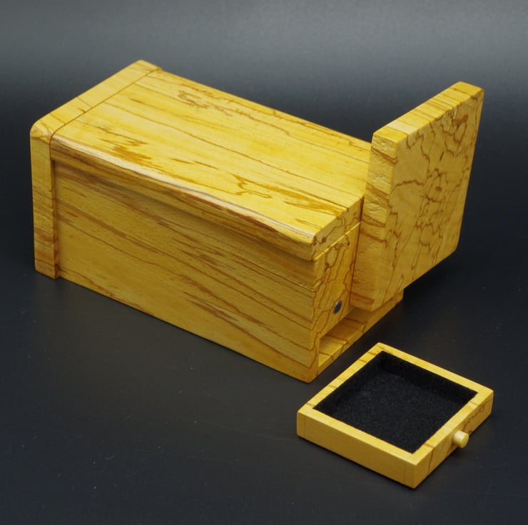The box has a hinged lid and two apertures. The end piece can be turned 90° to reveal the secret drawer.