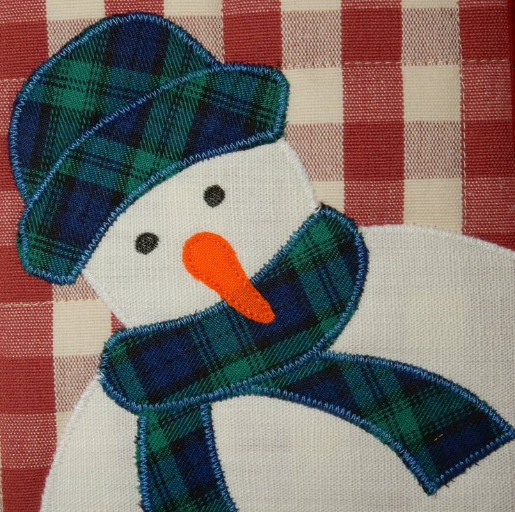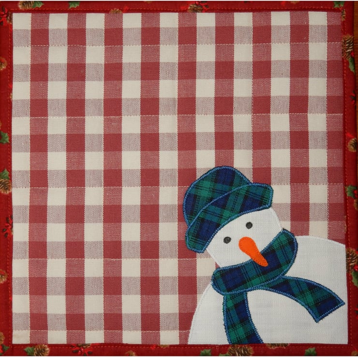 This lovely place mat/table centre is made from heavier weight gingham fabric, and has an applique snowman with his blue and green hat and scarf on the corner. It is quilted to enhance the effect. He is smartly dressed, and of course he has a carrot nose. The eyes are made with marker pen for safety reasons. This would make a place mat for a child or a table centre for a modern scheme.