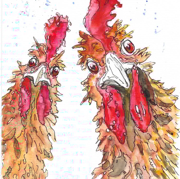Having camped at the farmer and when the chickens are let loose, they run and make noise. Roosters strut behind all that fuss. These Roosterd are very nosy as can been seen on the painting.
