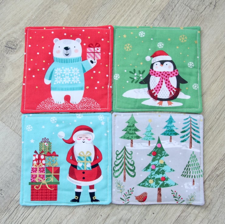 The main material is 100% high quality cotton each featuring a different festive picture, a polar bear holding a present, a forest of trees, a penguin also holding a present and a jolly Santa with a pile of presents. They are backed with a light blue, 100% high quality cotton, with a pattern of Christmas Trees. There is a layer of polyester eco-friendly wadding in the centre made from recycled plastic bottles. The layers are stitched together, with a layer of top-stitching around the edge.