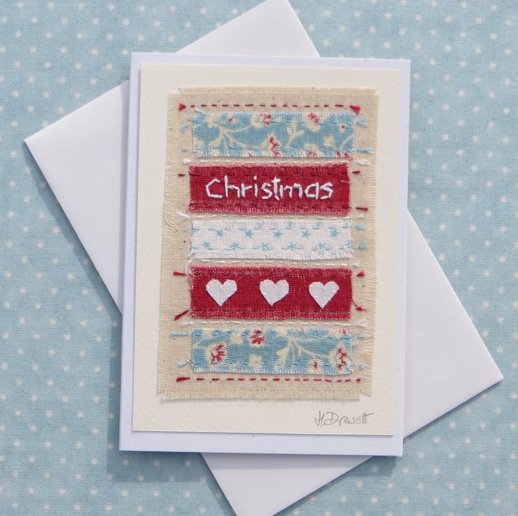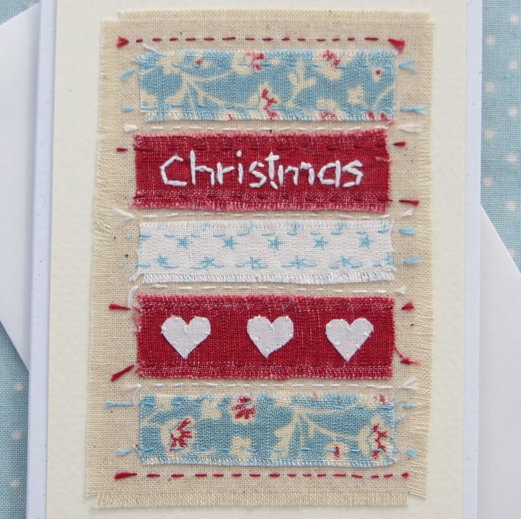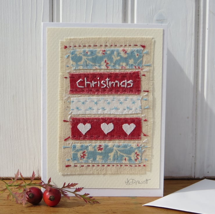This is a hand-stitched miniature textile mounted onto greeting card. I have hand-stitched the word Christmas onto plain red cotton adding tiny applique hearts. I have left the threads showing at the edges to give a homemade homespun feel to the little piece of hand-stitched work.