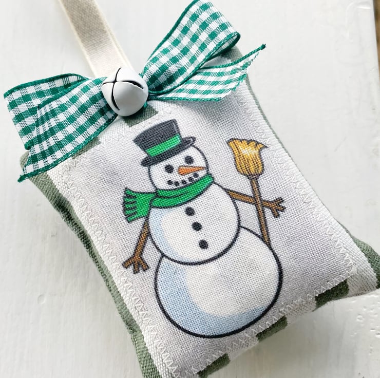 A jolly snowman is the focal feature of this fun and appealing hanging decoration. Wrapped up warm in a bright green scarf and with a top hat with a green band to match the green striped fabric and the gingham ribbon bow. There is also a matte white jingle bell and a linen hanging loop.