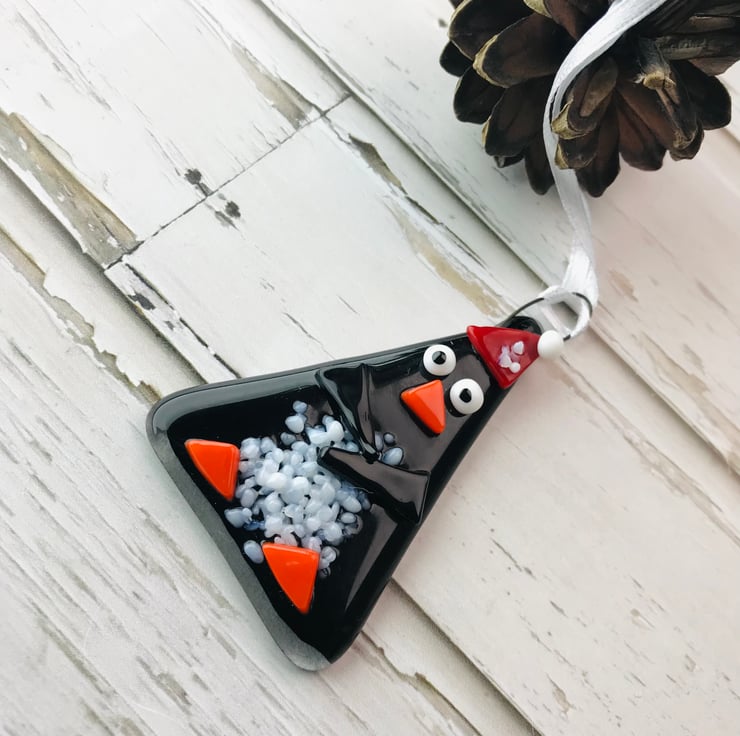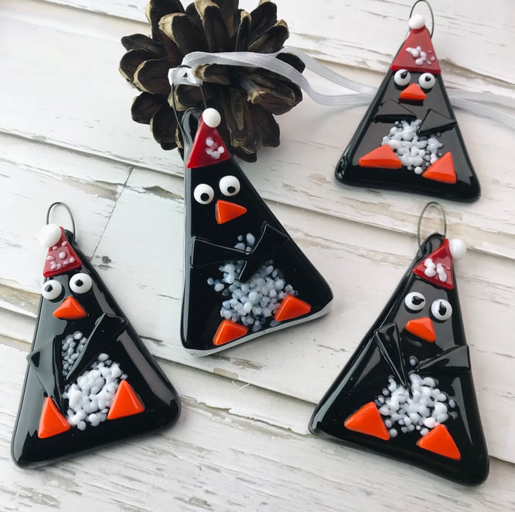 The penguin is made from two layers of hand cut glass which is fully fused before I add the face and body details. They measure approx 5 by 7cm.