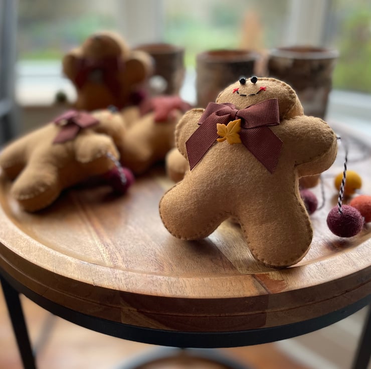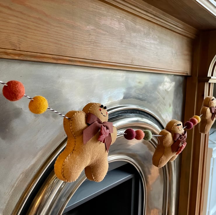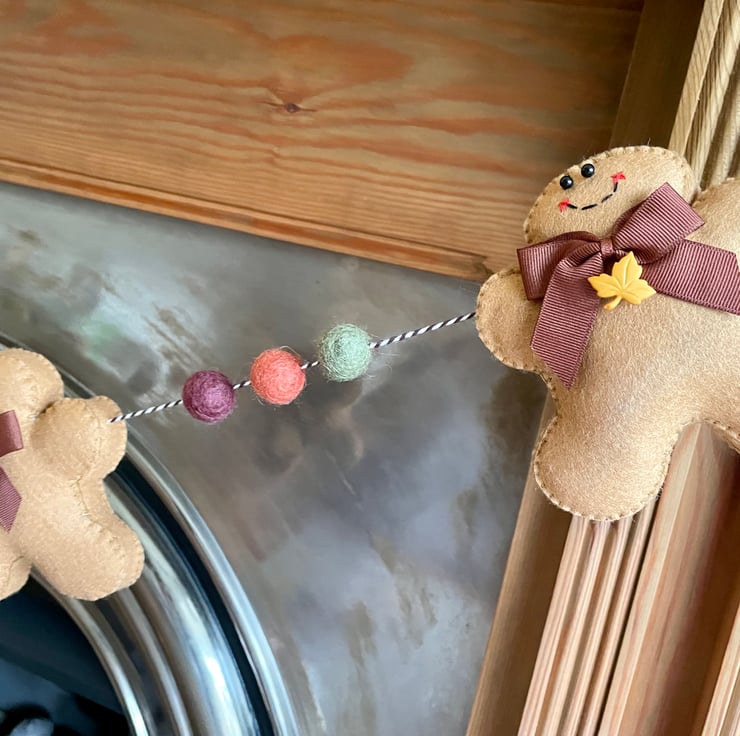 The garland is approximately 150cm in length. Each gingerbread figure is adorned with a maple leaf button in coordinating autumnal hues and a chocolate brown grosgrain bow. They are interspersed with with little felt balls in a combination of russet, aubergine, mustard and mossy green to complete the autumn spectacle.