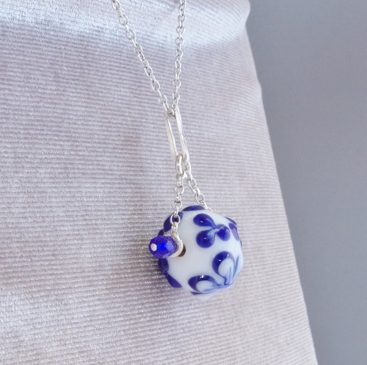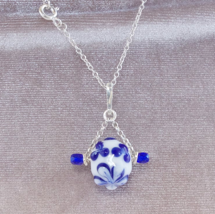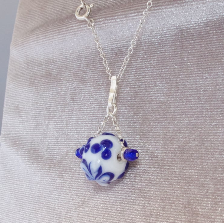 An unusual pendant comprising a delft blue and white central handmade lampwork glass bead mounted on solid sterling silver wire flanked by two intense and sparkling cobalt blue czech firepolish glass beads and suspended from my own design of bail on a sterling silver chain. The central bead features tactile embossed images of leaves and flowers in colours reminiscent of an antique Delft or Chines vase, and is a delight to handle and twist. The pendant measures 25 mm across by 30 mm in length from the base of the bead to the tip of the bail. The bail has been texturised with decorative hammer marks to complete the hand crafted ethos of this piece. it is supplied on a 450 mm sterling silver chain, fastened with a bolt ring clasp.