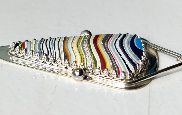 Made from years and years of build-up, this paint has now hardened sufficiently to be cut and polished. Lapidarists slice them up into pieces and shape them so that all the layers of colour can be seen. Jewellery makers then buy these smaller pieces to incorporate them into one-off pieces of jewellery for you!