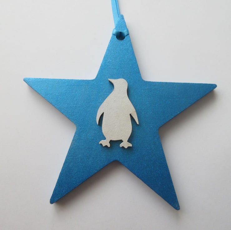 This is an MDF star, painted in metallic blue paint and embellished with a penguin shape which has been painted in white.