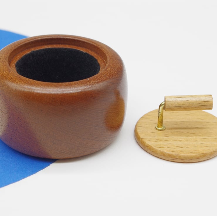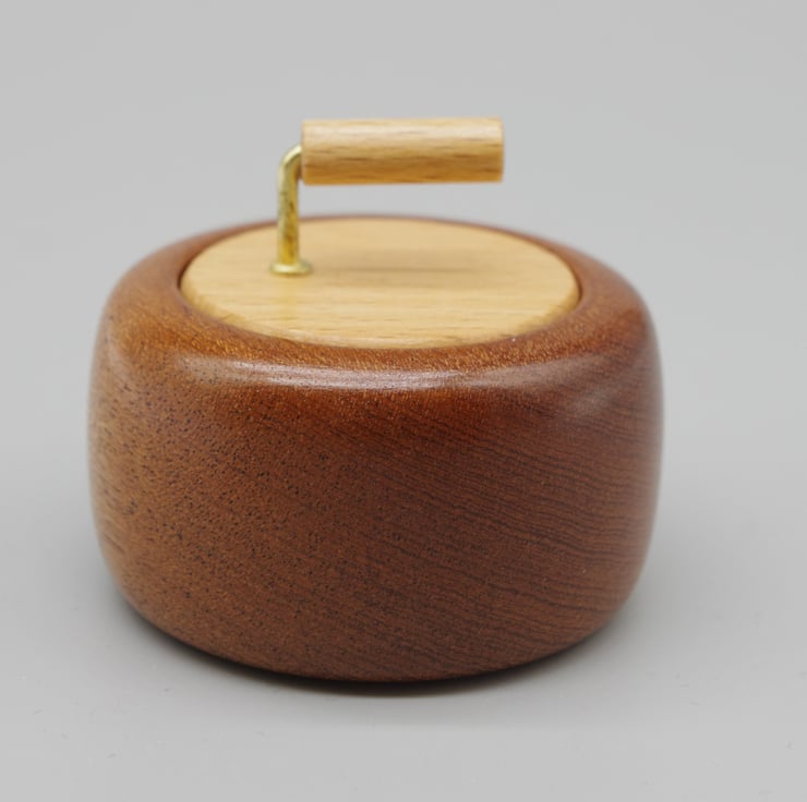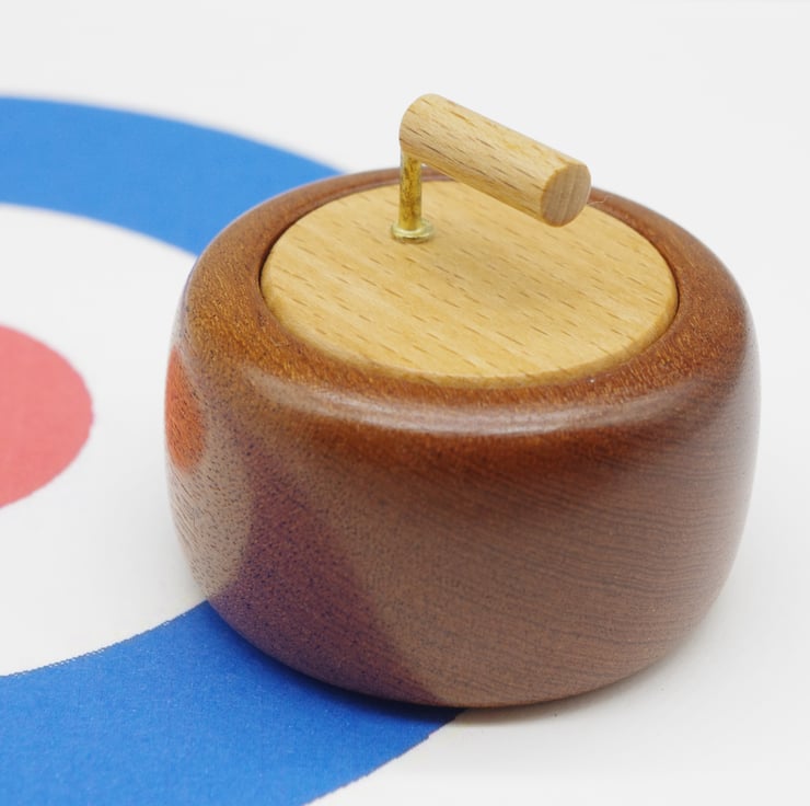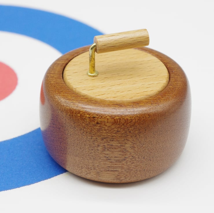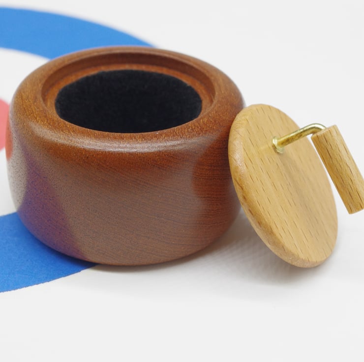 This delightful little ring box in the form of a miniature curling stone, is made from Mahogany with a beech lid.
