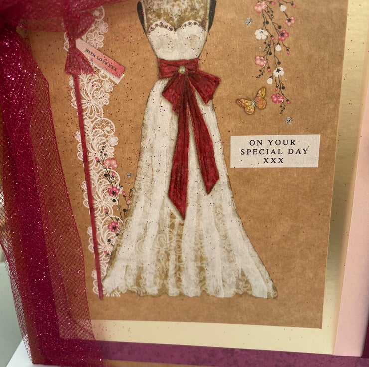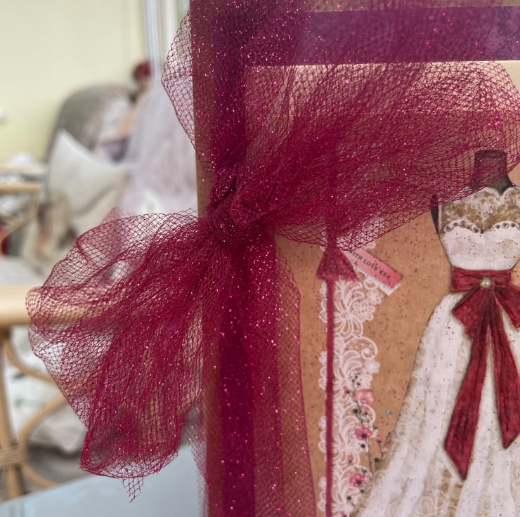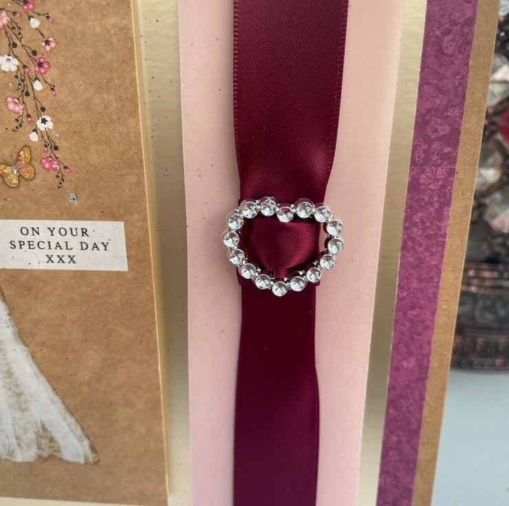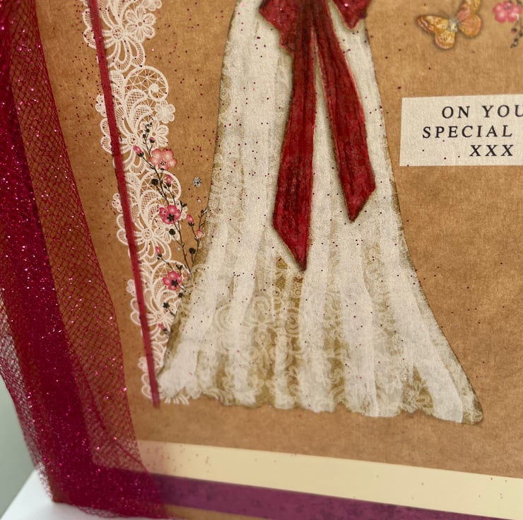 A beautiful and elegant card for a special occasion. This card is versatile as it has no specific greeting so birthday, anniversary or wedding can be celebrated with it. It’s made with a kraft card base, it’s a generous 8x8 inches in size. It has a gold mirror layer and then the beautiful top design. The card is finished with glittery tulle at the spine and a satin ribbon with a heat ribbon slider to the other side. A greeting could be added to the inside.