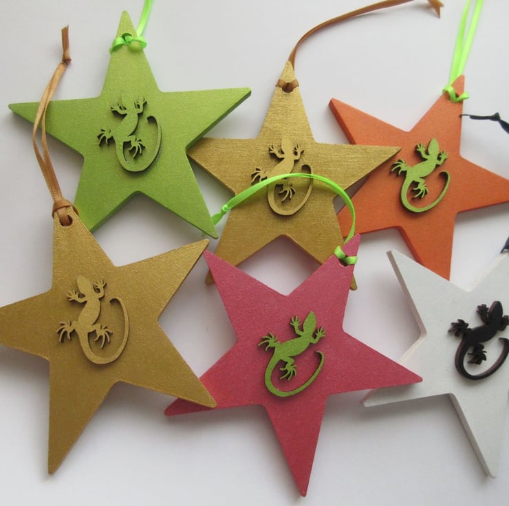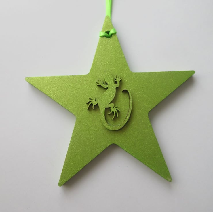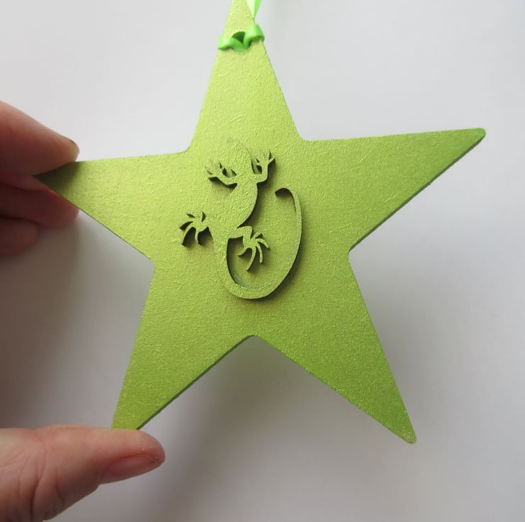 This is an MDF star, painted in lime green metallic paint and embellished with a lizard shape which has been painted in the same shade