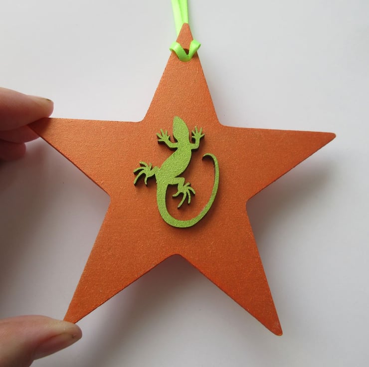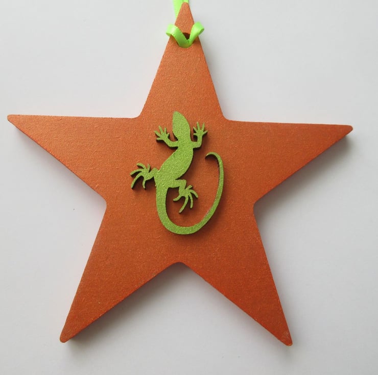 This is an MDF star, painted in orange metallic paint and embellished with a lizard shape which has been painted in metallic lime green.
