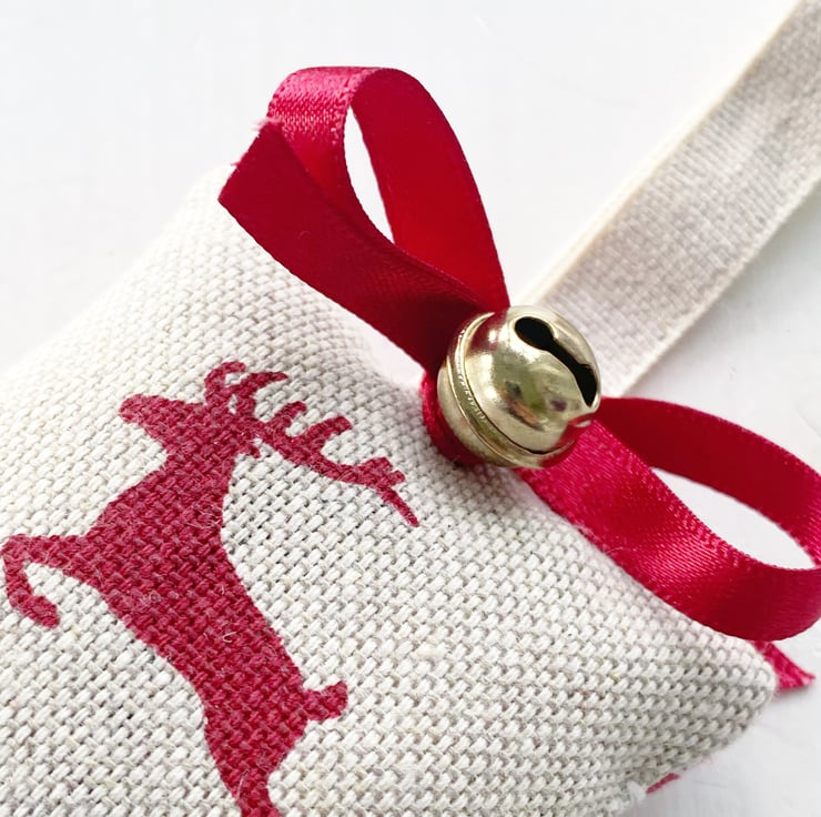 The elegant silhouette of a leaping reindeer, forelegs tucked and with impressive antlers! In dark red on a taupe background and with festive red and white gingham on the reverse side. Finished with a gold bell, a red satin ribbon bow and a linen ribbon hanging loop. Filled with toy-grade stuffing and whole cloves for a warm and spicy Christmas aroma.