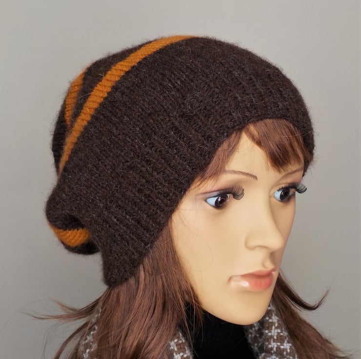 A colourful casual beanie hat, handknit from pure British wool from "Jacobs" sheep. The deep brown contrasts well with the mustard orange stripes. The deep ribbed welt can be turned back for an extra cosy layer over your ears. The sweet little "Roses Workshop" brand label is laser etched faux leather.