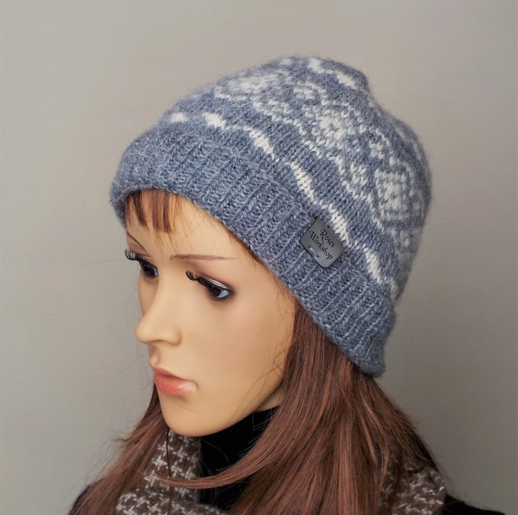 Subtle style in grey and natural cream. I have used pure British Masham wool to hand-knit this lovely women’s beanie hat. It is knitted to a design based on traditional Fairisle, with a stretchy ribbed welt to keep your ears warm. The sweet little "Roses Workshop" brand label is laser etched faux leather.