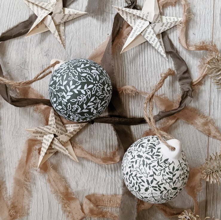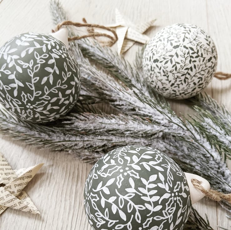 These baubles are a Christmas twist of my easter best seller - painted easter eggs. I've switched the powder blue for a rich forest green, and the flowers for holly leaves!