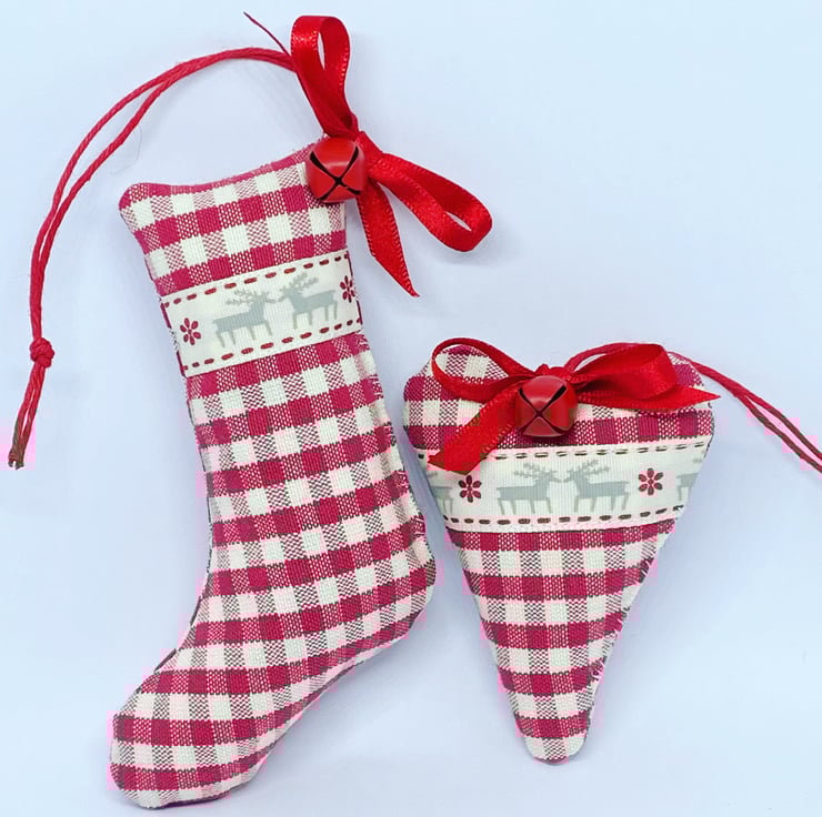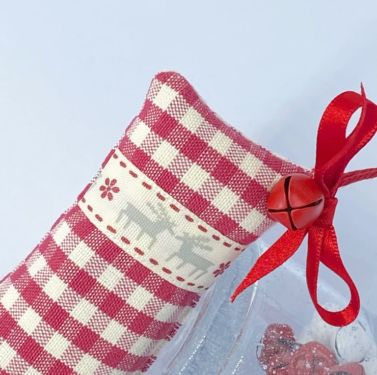 A classic Christmas stocking decoration in red and white gingham, featuring two reindeer on the point of a Christmas kiss! Each stocking decoration is adorned with a red metal jingle bell and a red satin ribbon bow, plus a red hemp twine hanging loop. Padded with toy-grade stuffing and whole cloves for a warm and spicy Christmas aroma.