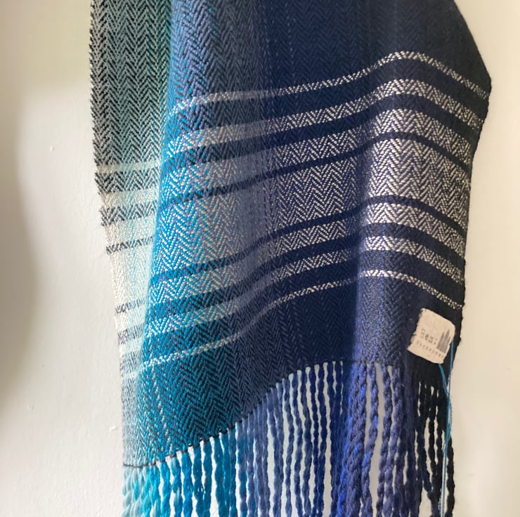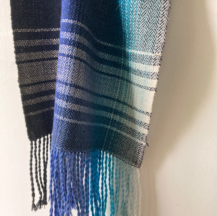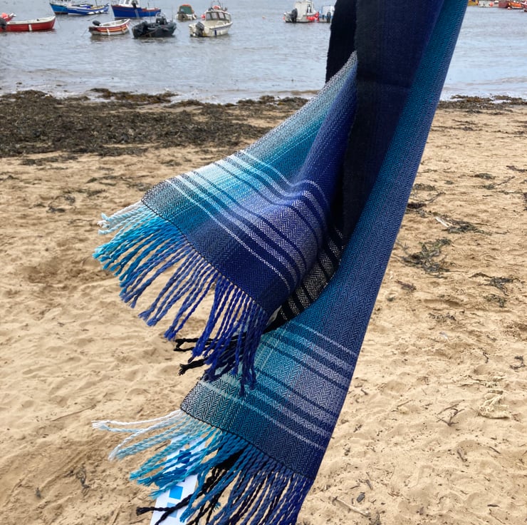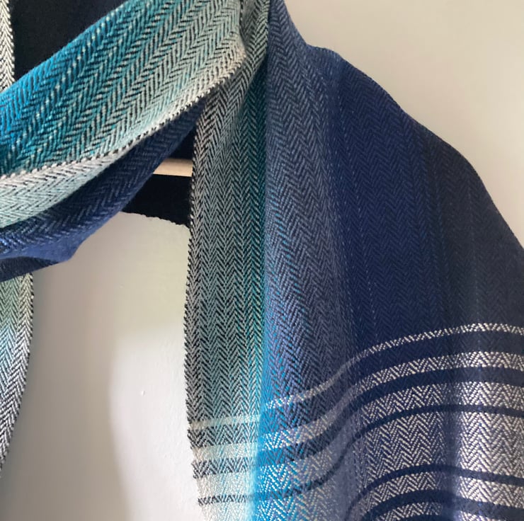 Handwoven in 6 shades of very fine Merino lambswool in a Fibonacci gradient. Gently shifting from deep navy through turquoise and teal, to lighter shades of sea spray , the scarf plays with colour and light when wound around the neck creating dramatic shifts in light and dark. Woven in a classic herringbone, the scarf is embellished with pale gold silk weft at each end. Inspired by the play of light on the waves at Sands End, this is the perfect weight of scarf, and is great for people sensitive to wool as Merino is smooth, non itchy and naturally regulates temperature. Very light, with a good drape.