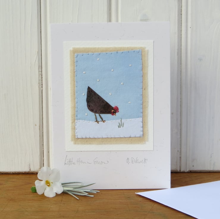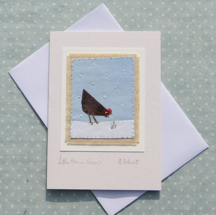 All my cards measure 12 x 9 cm and come with toning recycled paper envelopes in clear protective compostable cornstarch sleeves, no plastic! Each card is signed on the front and my studio stamp is on the back. Cards are made from stout 100% recycled card - blank inside. The title is written below the textile: 'Little Hen in Snow'.