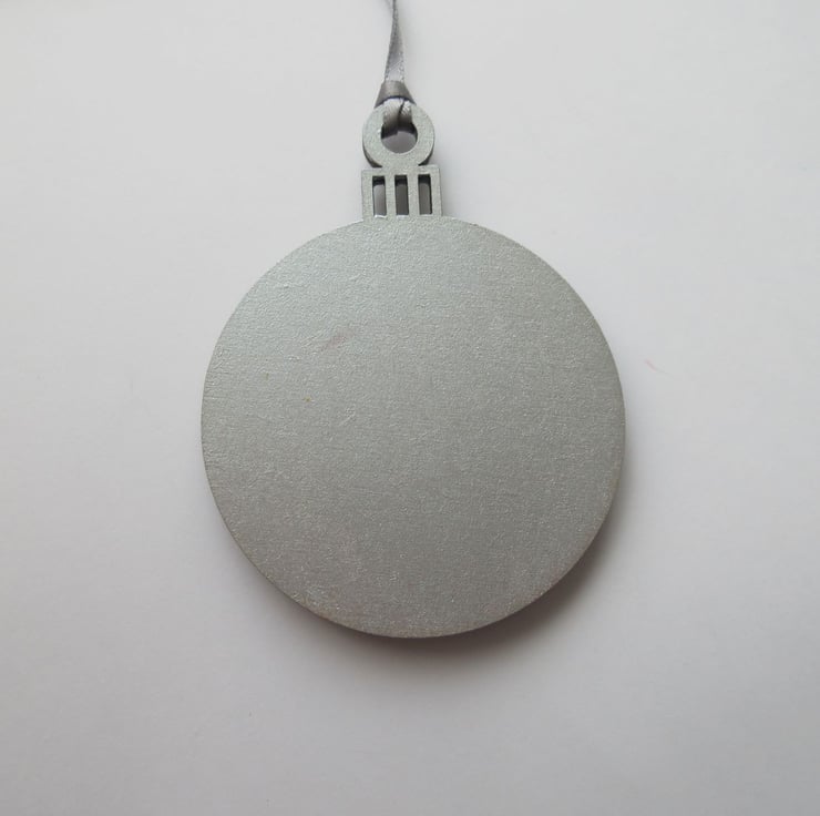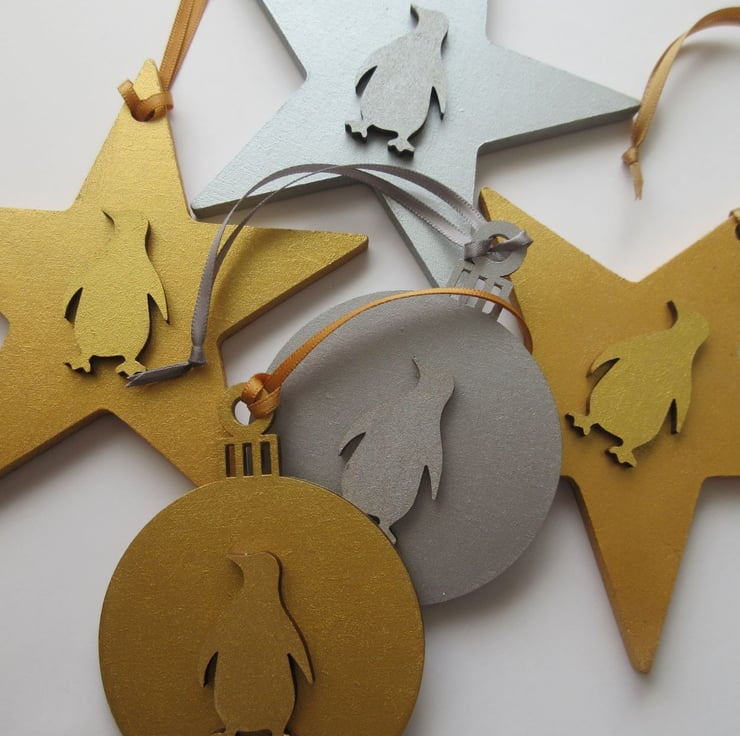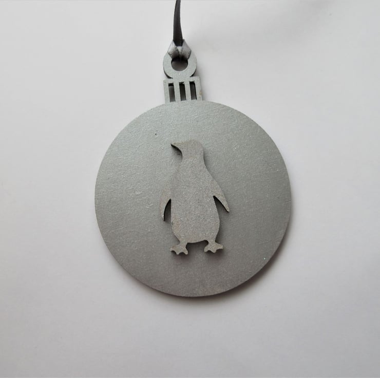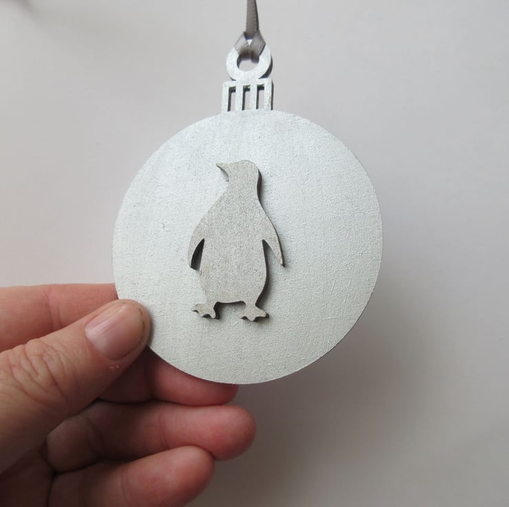 This is a wooden 2D Christmas bauble, embellished with a wooden penguin shape.