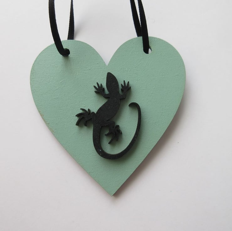 This is a wooden heart, embellished with a wooden reptile / lizard / newt.