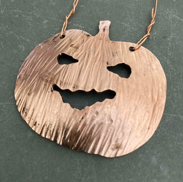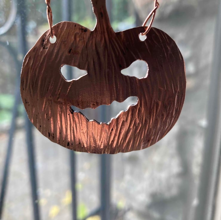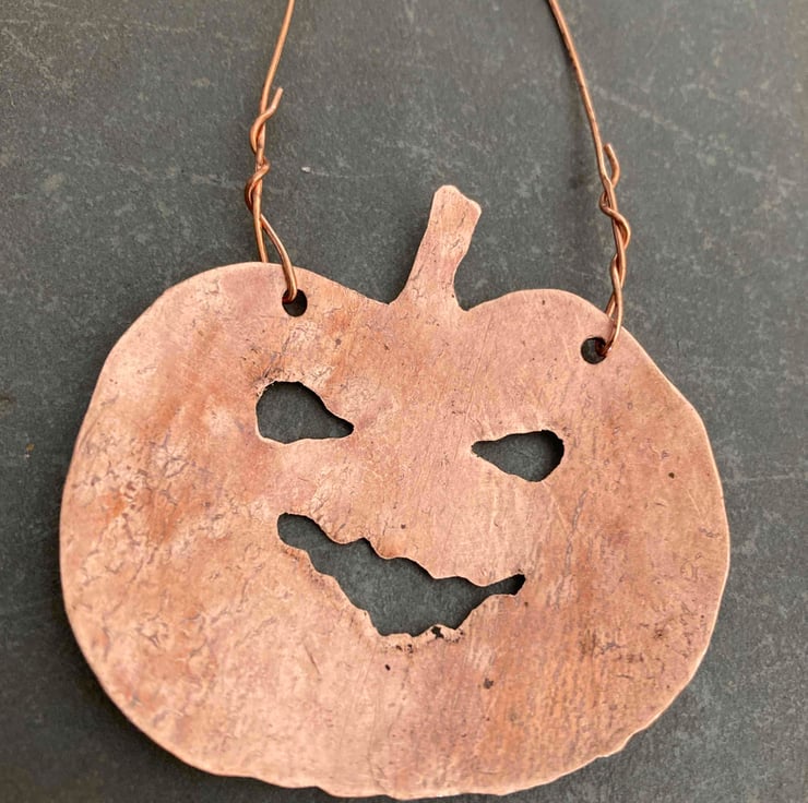 Copper pumpkin lantern shaped hanging decoration, hand made from pipe reclaimed from a microbrewery. Approx 5cm wide, with hammered texture on the front and natural finish on the back. As these are made of reclaimed metal, there are flaws in the finish that you would not get on new metal, but these are part of their charm!