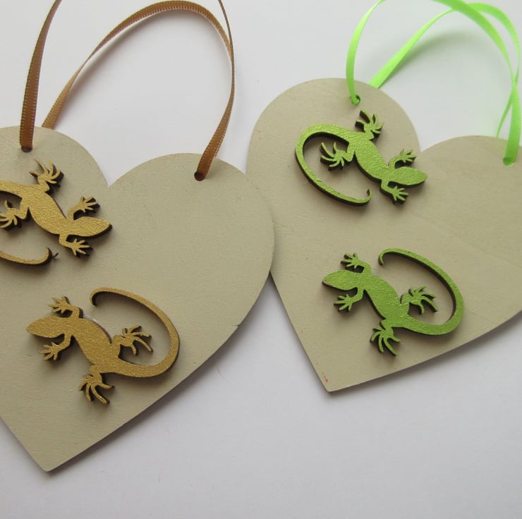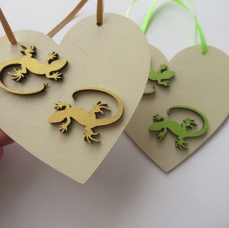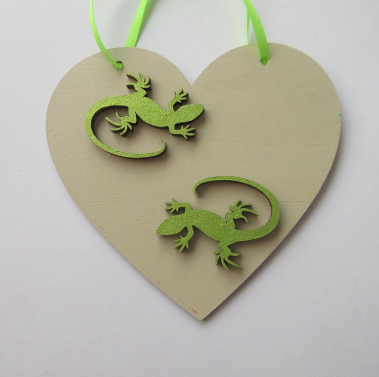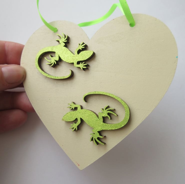 This is a wooden heart, embellished with two wooden reptile shapes.