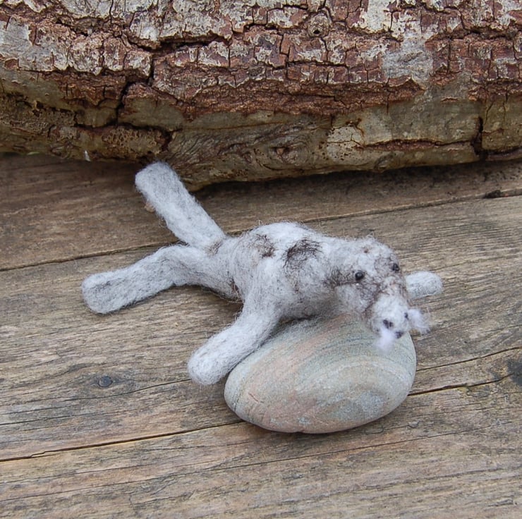 Basking grey seal .  Needle felt seal attached to a found pebble