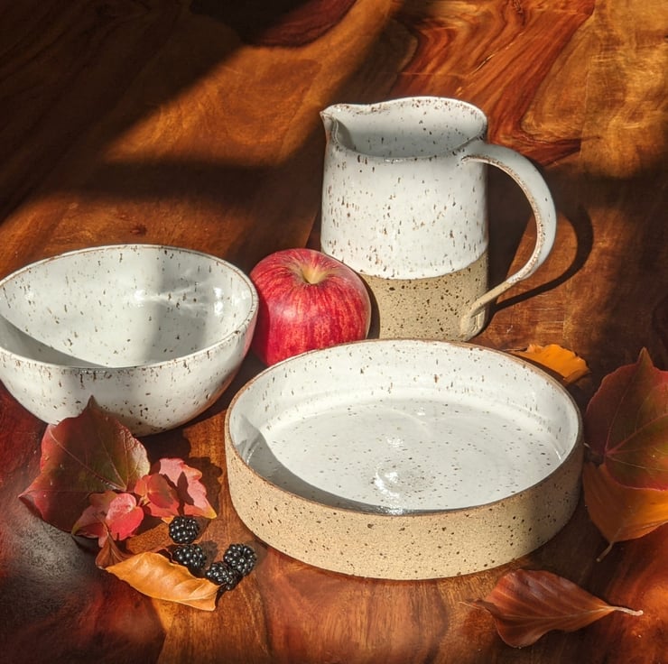This is part of my Farmhouse Kitchen collection. Living in an old farmhouse, where the kitchen is the heart of the home, I love to serve meals using my rustic, earthy tableware. The whites go with everything and I have a thing about speckled clay. I hope you love it's simple, slow living style too!