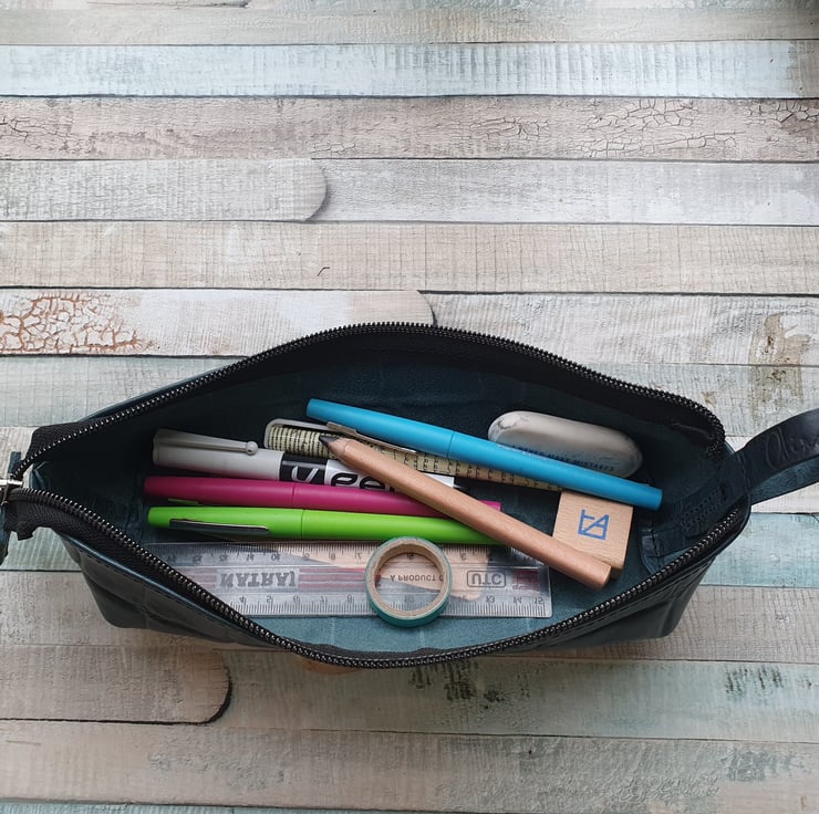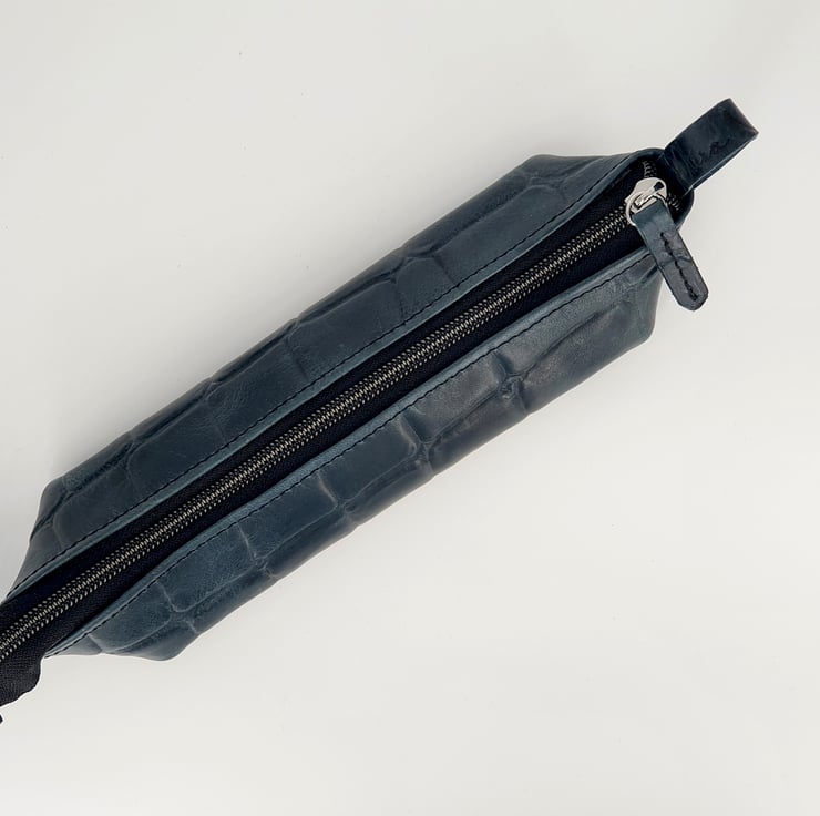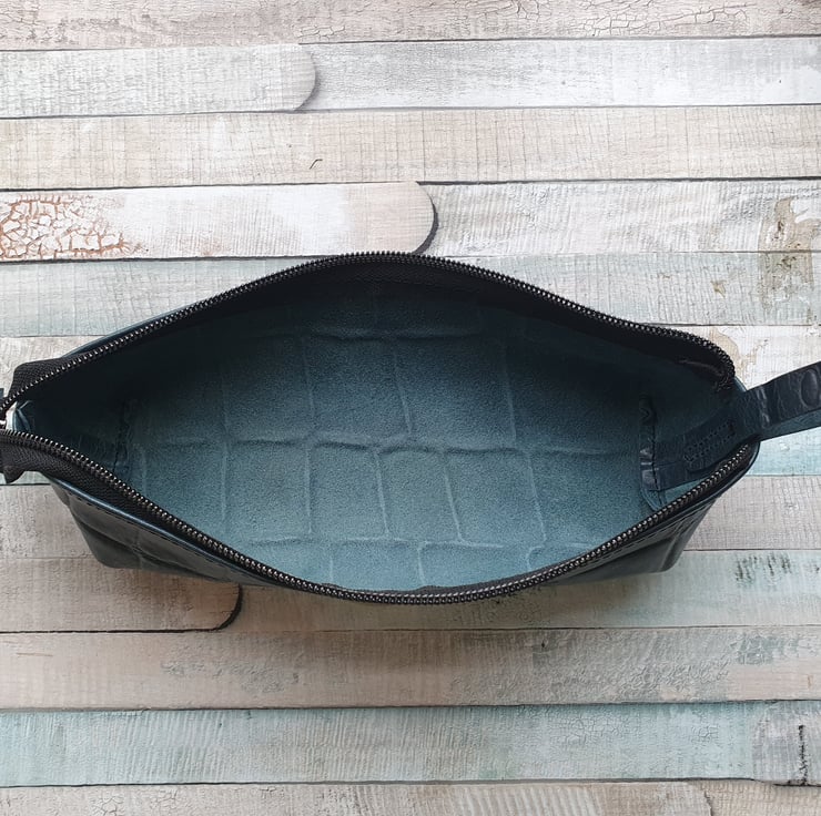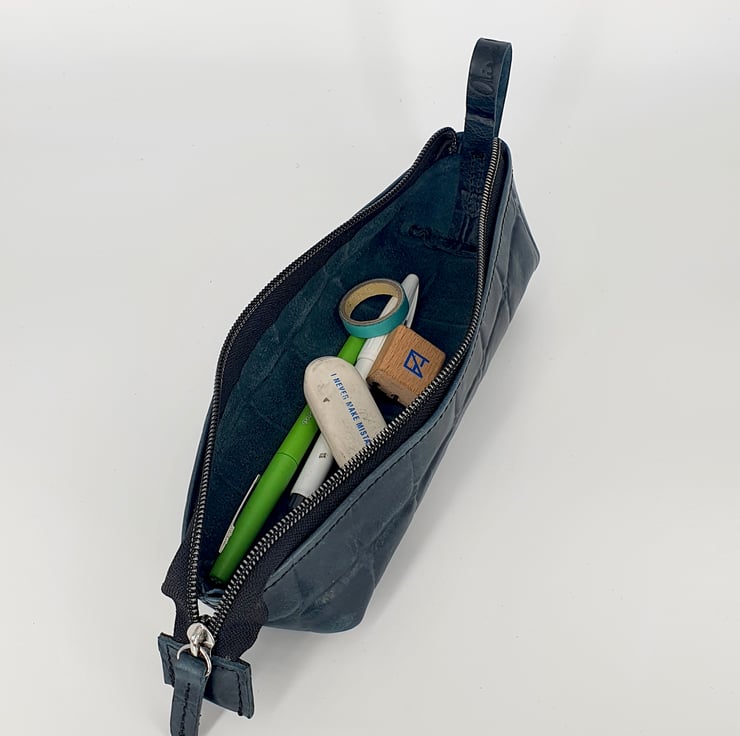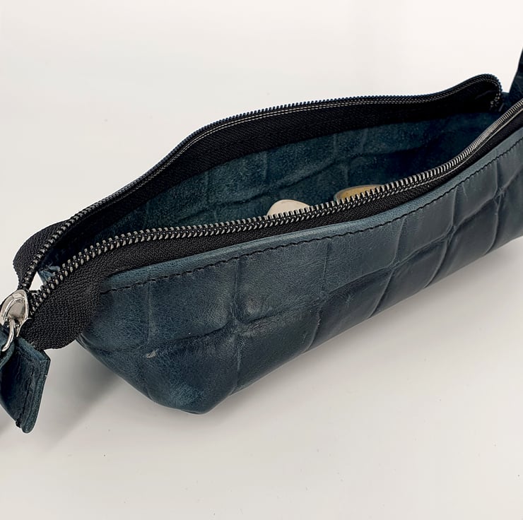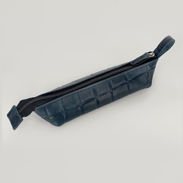 This leather has a nice chunky mock-croc print in an exquisite shade of petrol blue. The leather is a veg tan with a really lovely pull-up and should gain an amazing patina with time and use.