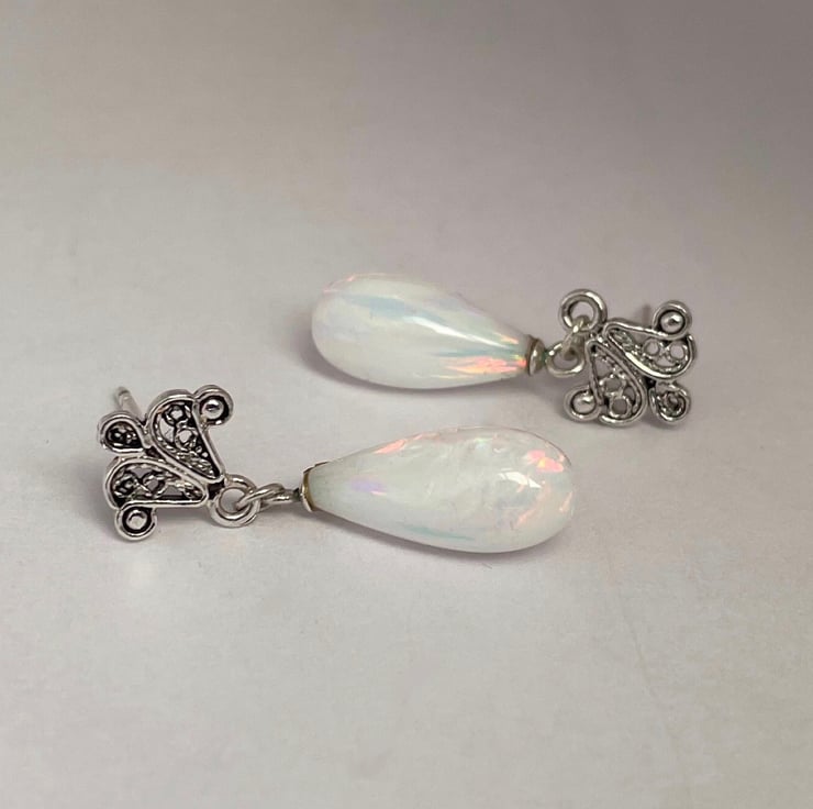 Beautiful synthetic Opal briolettes, teamed with sterling silver fleur de lys ear studs, make lovely drop earrings for a night out. Opals are the birthstone for October.