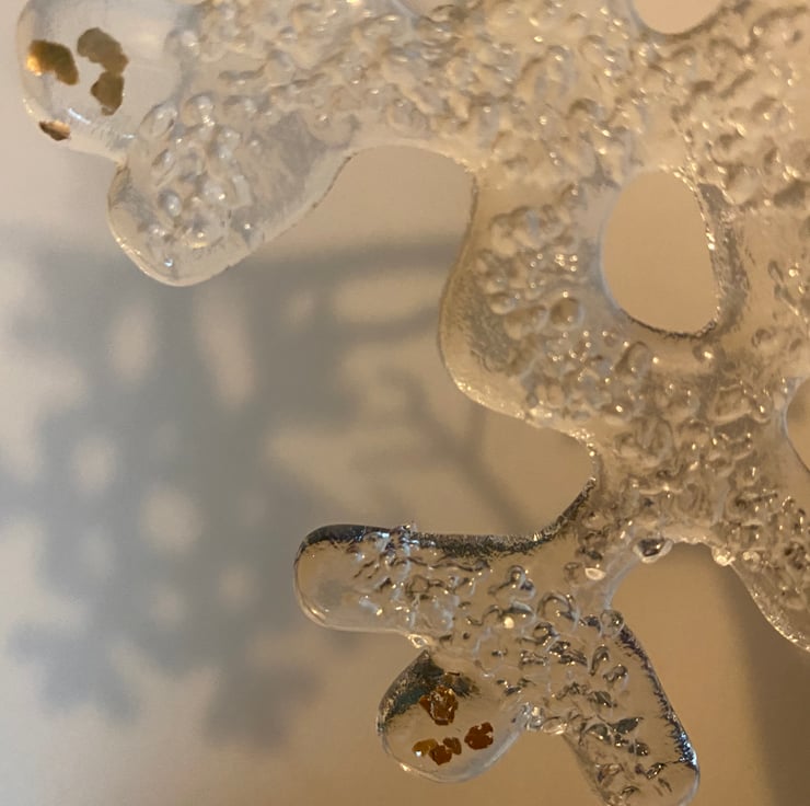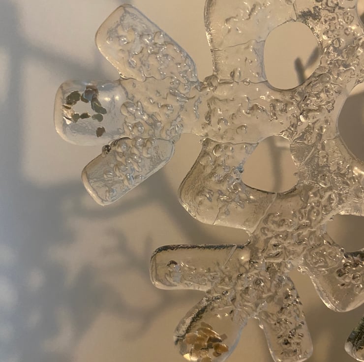 These large glass snowflakes have each been made with over 40 separate pieces of glass, hand cut and carefully arranged to form a snowflake when fused in the kiln. There are two to choose from - either tiny silver-coloured or gold-coloured flakes fused between the glass at each of the six points of the shape. A layer of glass ‘frost’ is then sprinkled on top before a second fusing.