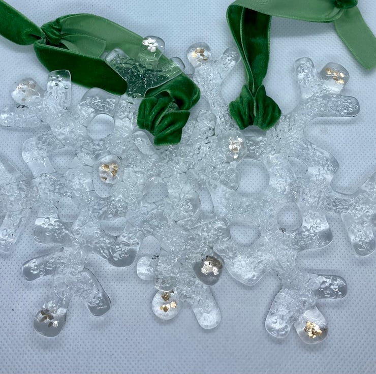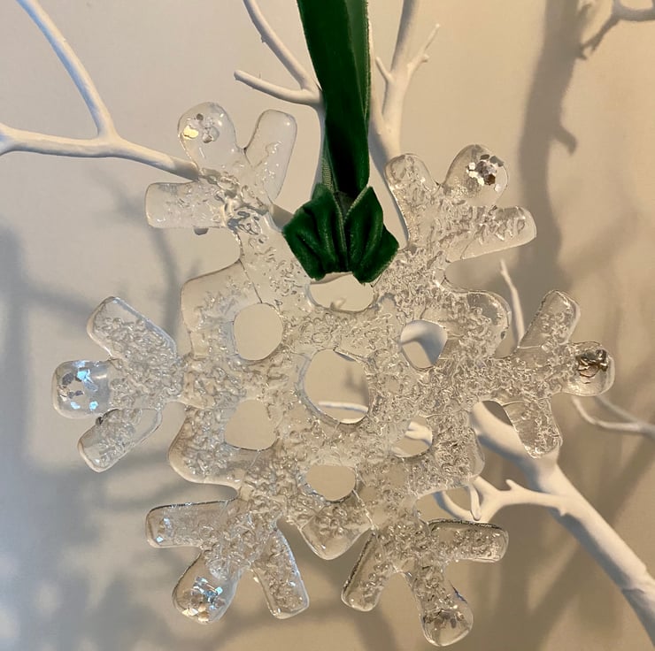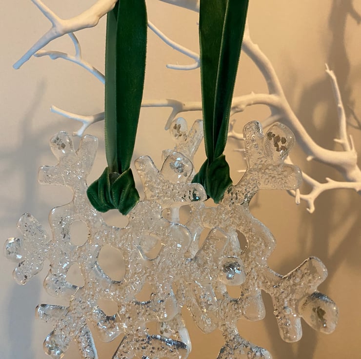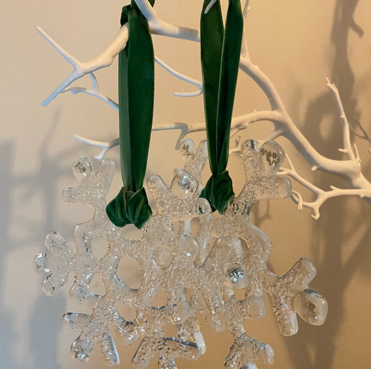 Measuring approximately 13cm in diameter, each snowflake is attached to a piece of lovely, green velvet ribbon ready for hanging but this can be changed for white organza ribbon if you prefer - just add a message.