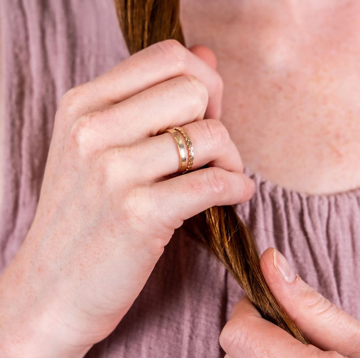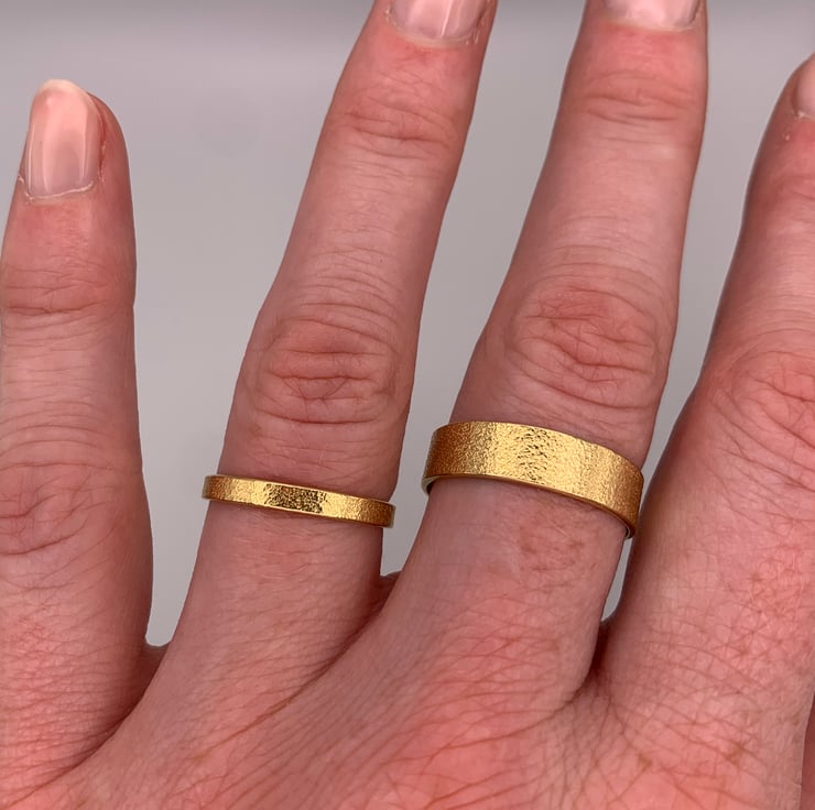This is a classic band ring made with 9ct gold it has a lovely soft textured finish on the outside surface. It has a slim profile making it perfect for everyday wear - an ideal wedding band.