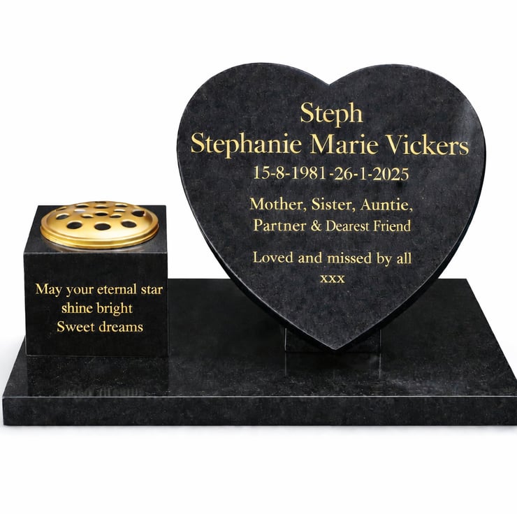Personalised Black Granite Memorial Grave Plaque incorporating a matching Black Granite vase and Black Granite Heart (Price includes all personalisation)