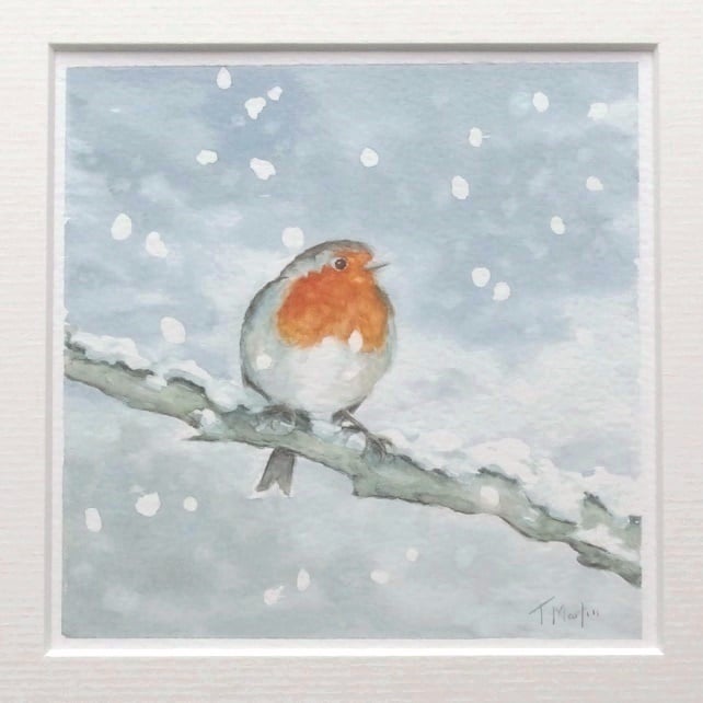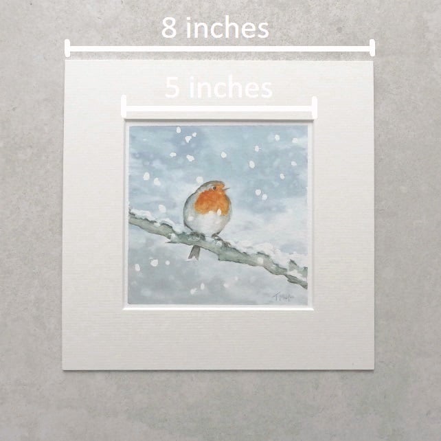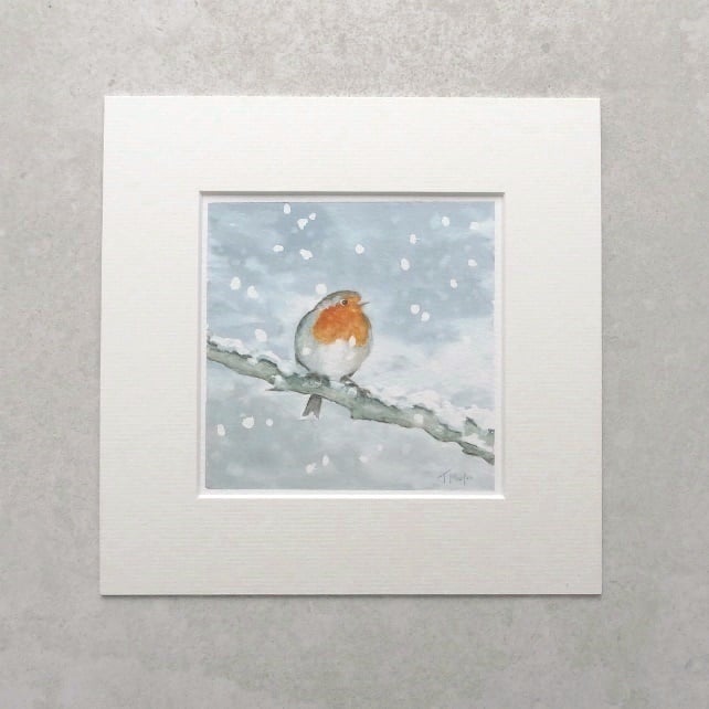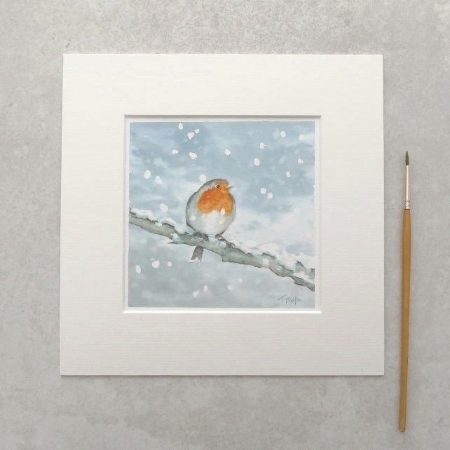 This small original watercolour snowy bird painting 'Winter Robin' comes with a quality soft white mount and backing board ready for framing. It has been painted using quality watercolour paints on 300gm acid free watercolour paper.