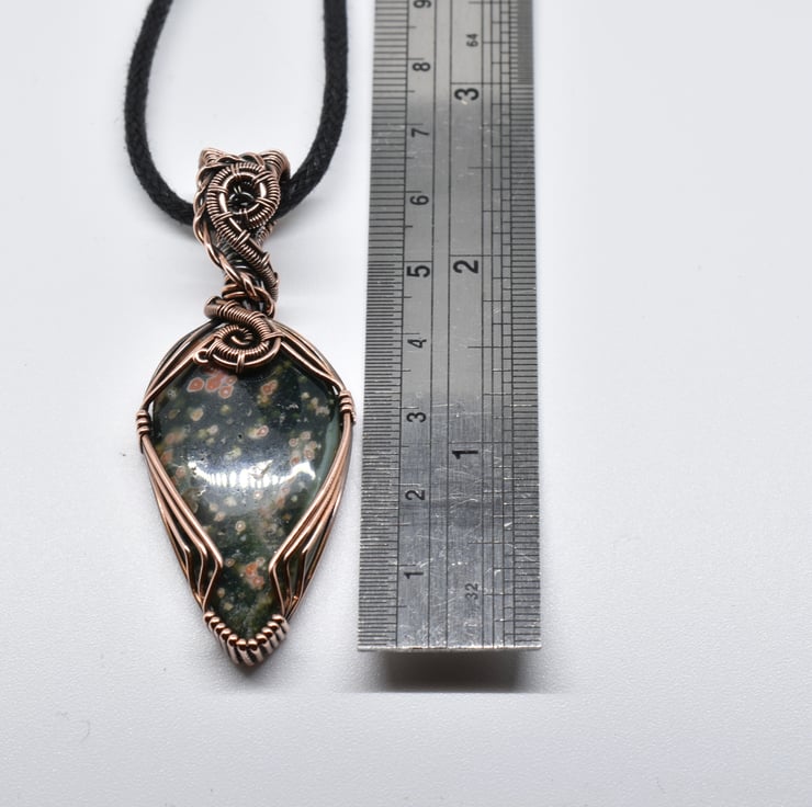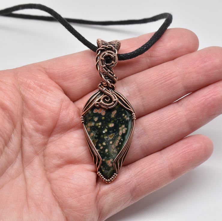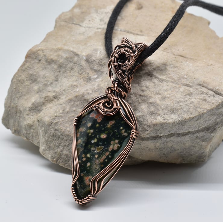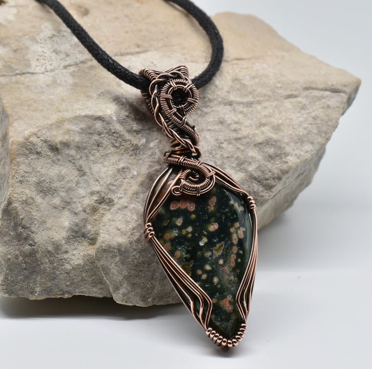 A beautiful ocean jasper wire wrapped using solid copper wire to make this unisex pendant.