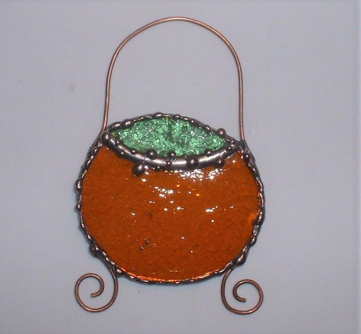 A bubbling witches cauldron made from orange and green textured glass with decorative solder and copper wire detail. Made in the Tiffany style the glass has been hand cut and copper foiled before being soldered together then finished with a copper patina polished to shine, it measures approx. 2.5 x 4"