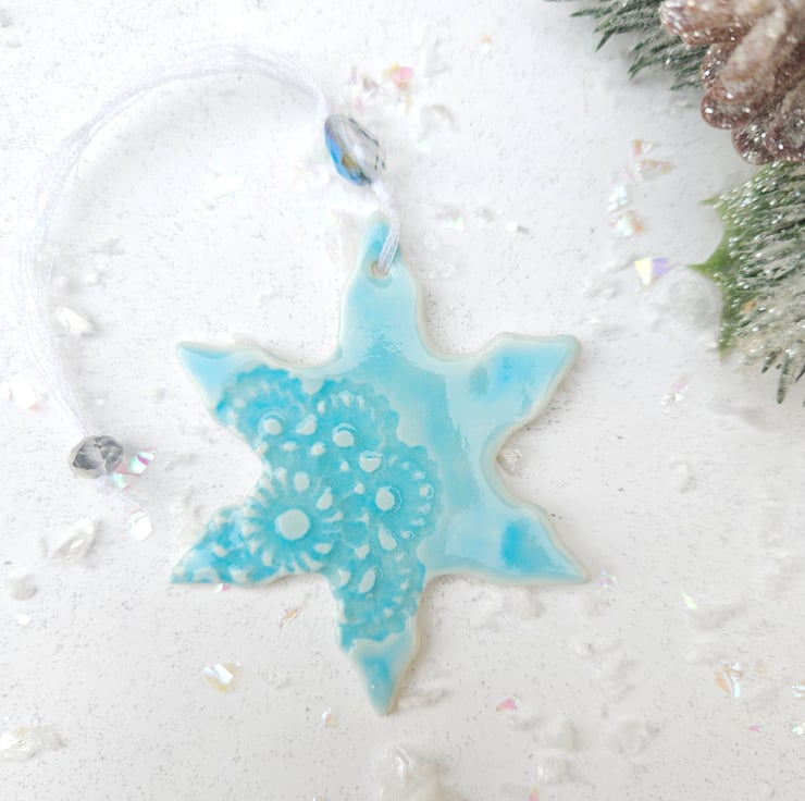 This fine porcelain snowflake is imprinted with lace on both sides, before going through its first firing. It is then glazed with a pale blue glaze, that pools into the lace imprints to give a deeper colour highlighting the lace pattern.