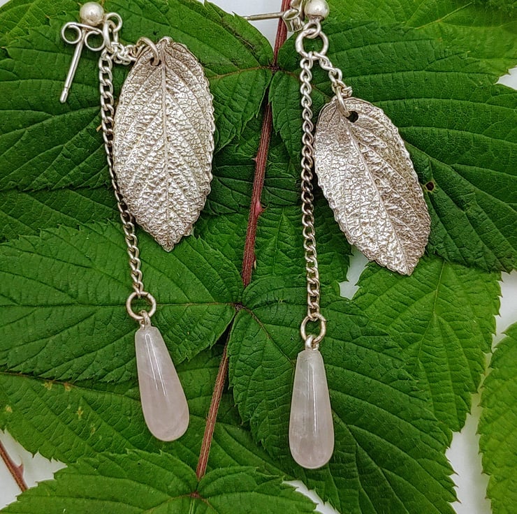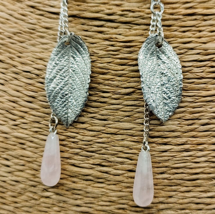 Formed in fine silver from real wild rose leaves and accentuated with rose quartz drops, these earrings are truly unique. Because they are made from real leaves, each one is subtly different and there will never be another exactly like yours. They are lightly patined to enhace the warmth of the rose quartz.