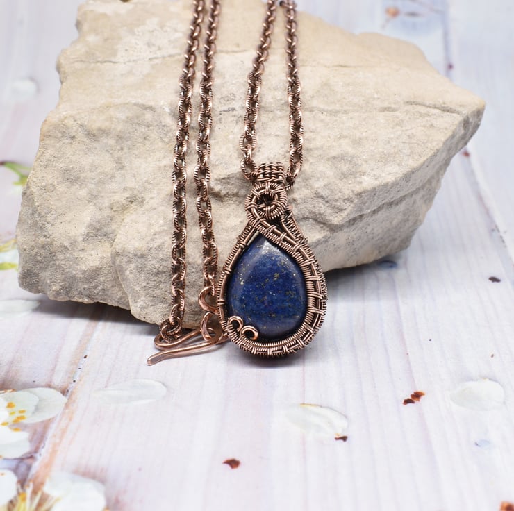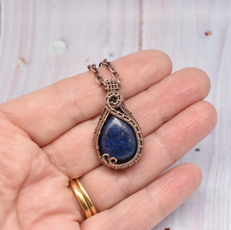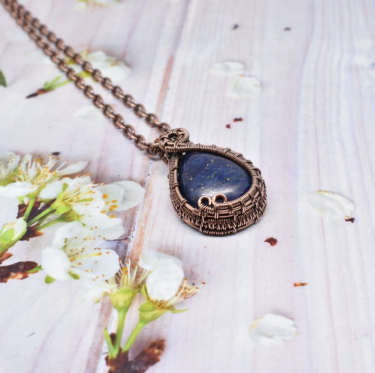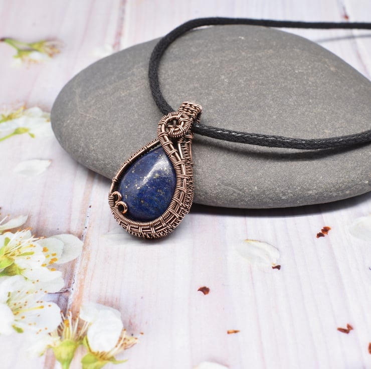 This dainty lapis lazuli pendant has been handmade using solid copper wire woven around the stone and completed with a woven bail.