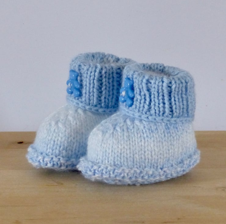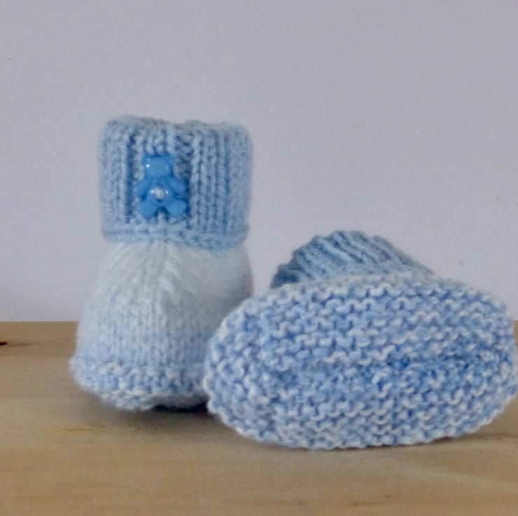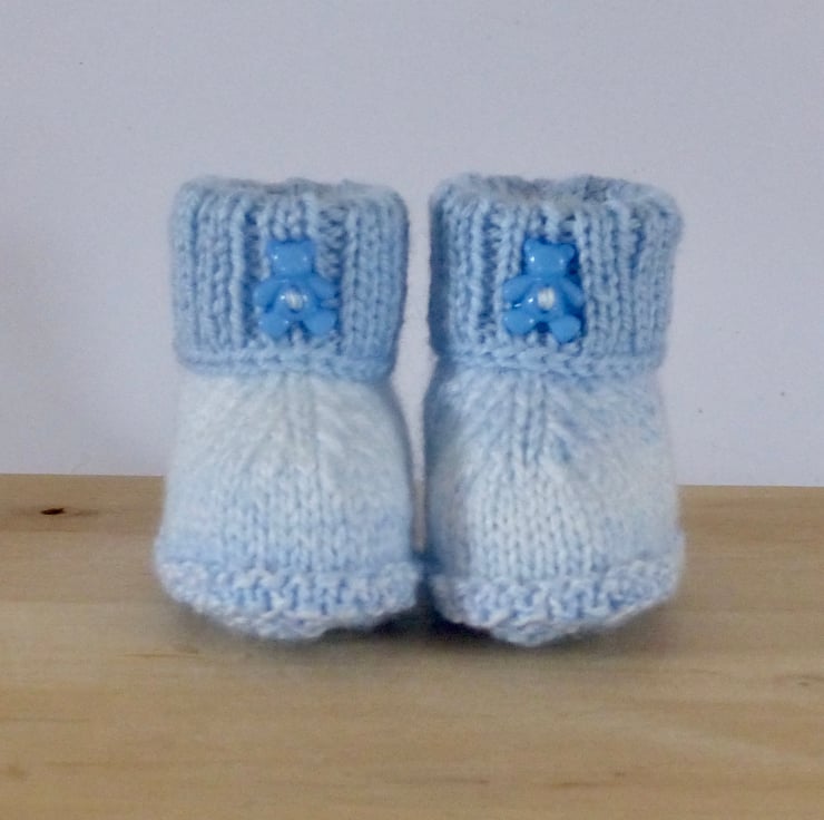 A pair of hand knitted booties in white and blue yarns. The foot is a 'marble' yarn and the turn down top is in a plain light blue. They measure approximately 4" from heel to toe and have Teddy Bear buttons securely stitched to the fronts. An ideal Baby Shower Gift or New Baby Gift.