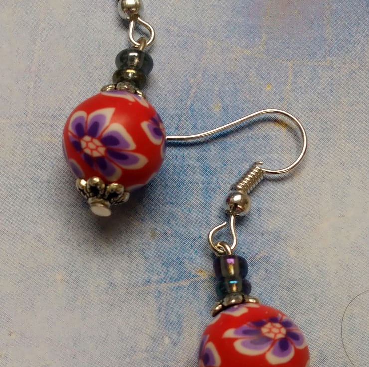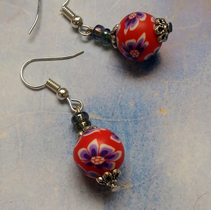 Stunning round, vivid red polymer beads with purple and white flowers. With Tibetan sparkly silver spacer beads and iridescent glass beads. Sparkly, gorgeous and handmade. Sterling silver nickel free hooks. Free UK postage.