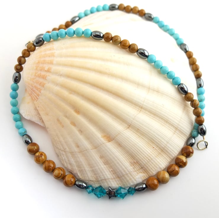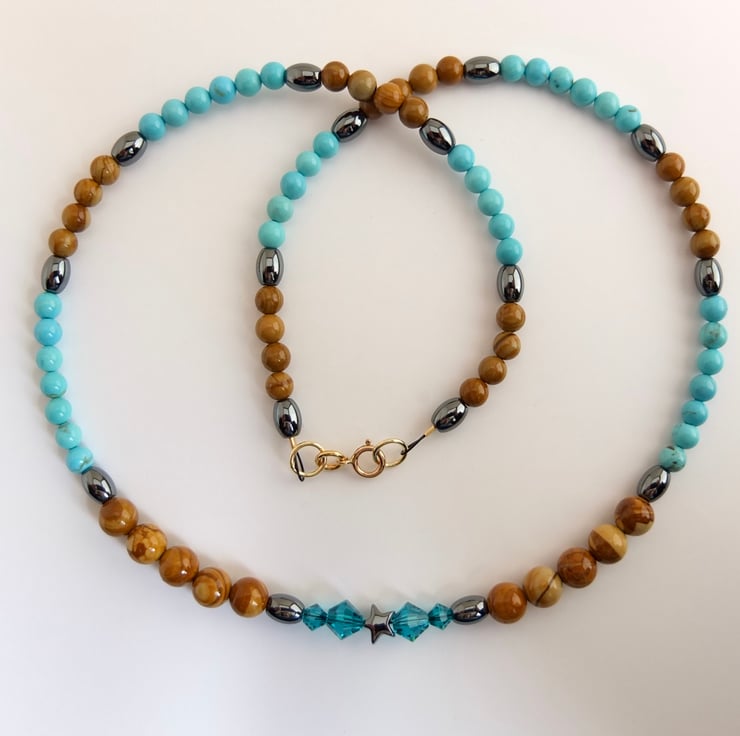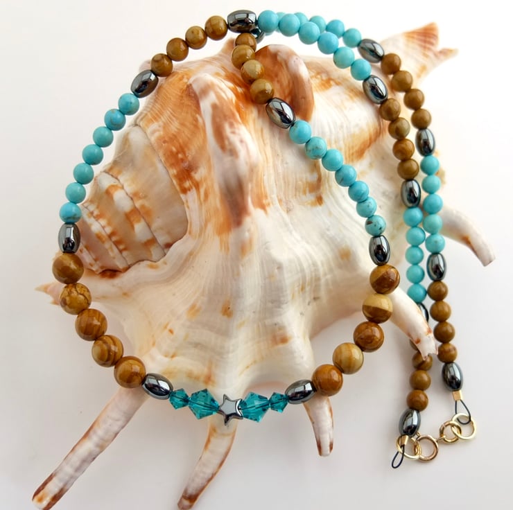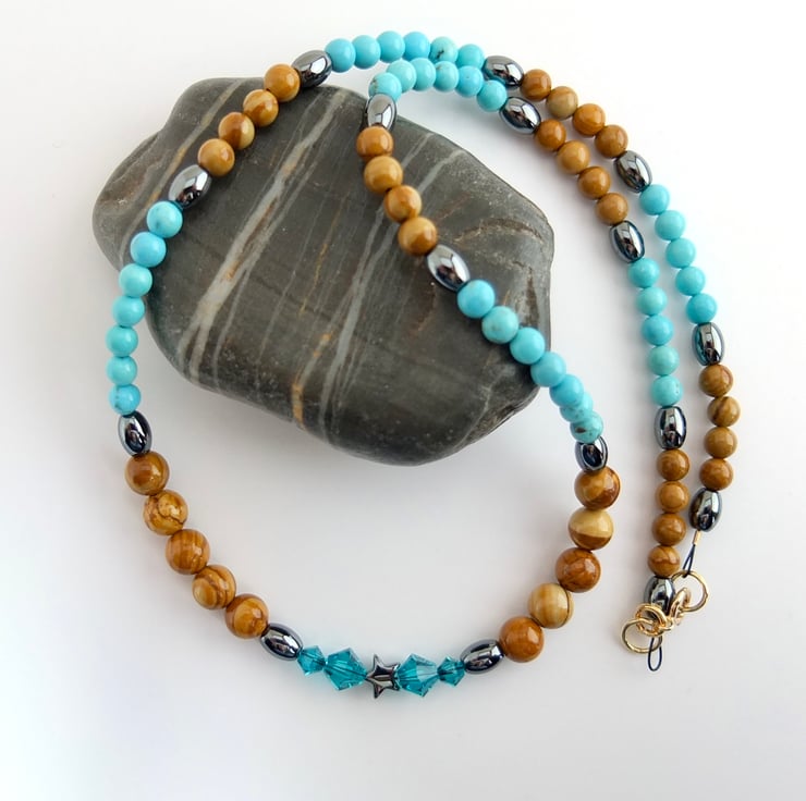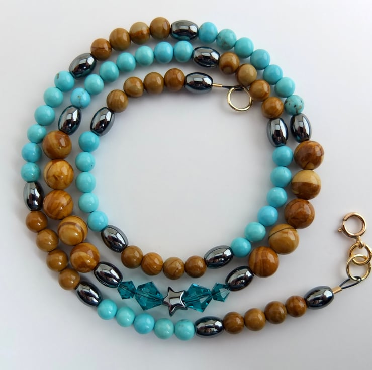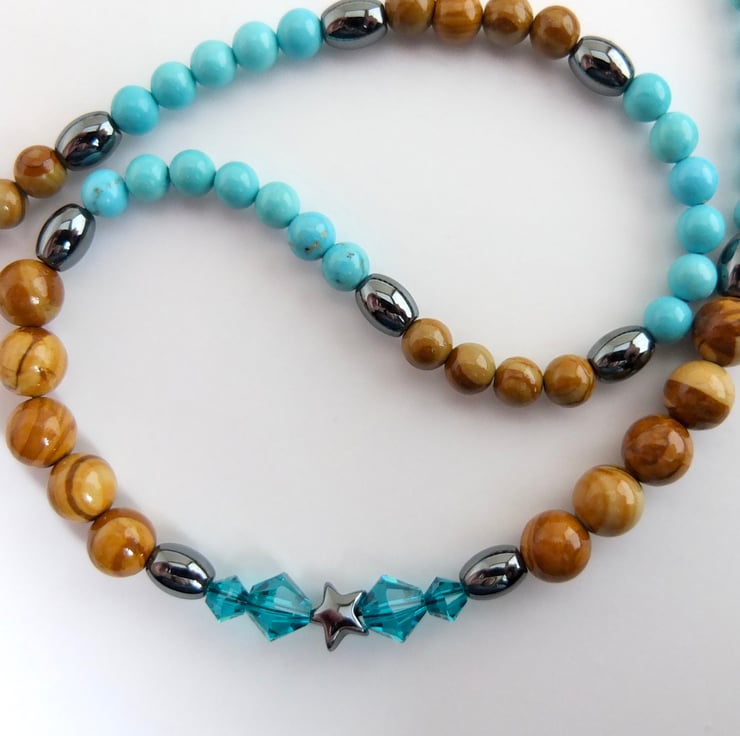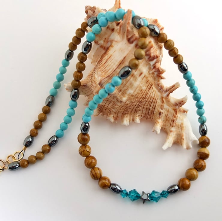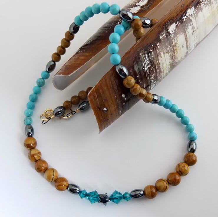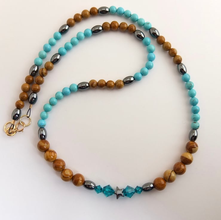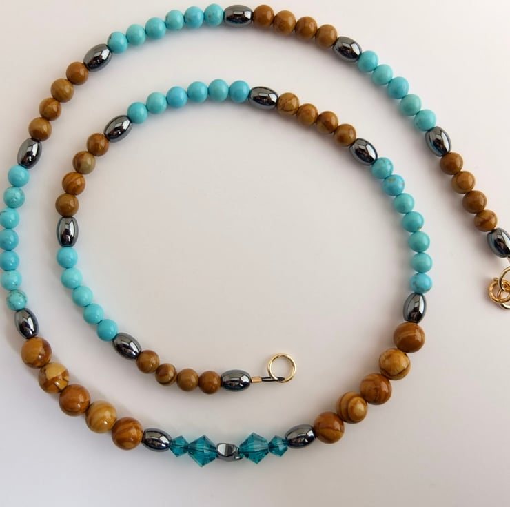 Pretty necklace of wood lace stone and turquoise howlite beads separated by hematite ovals.