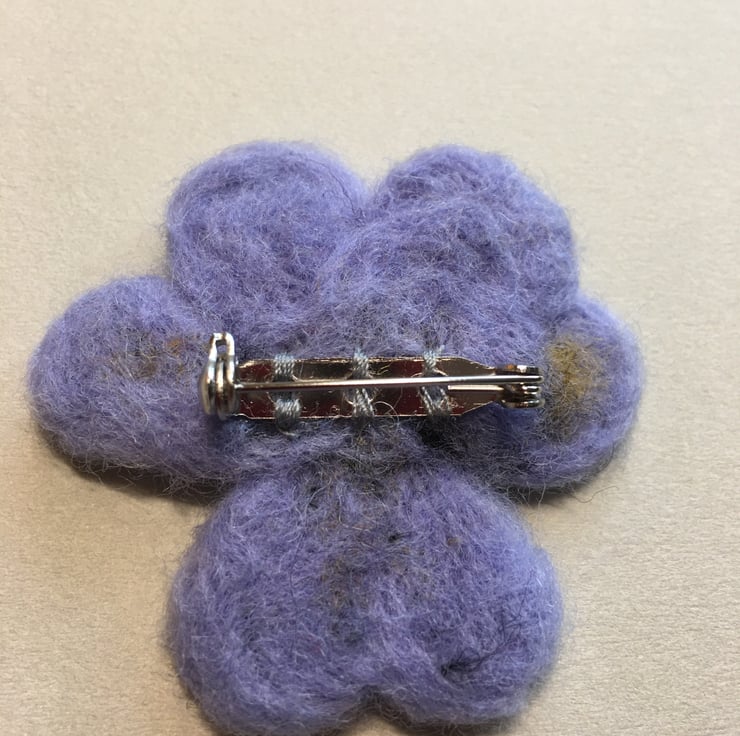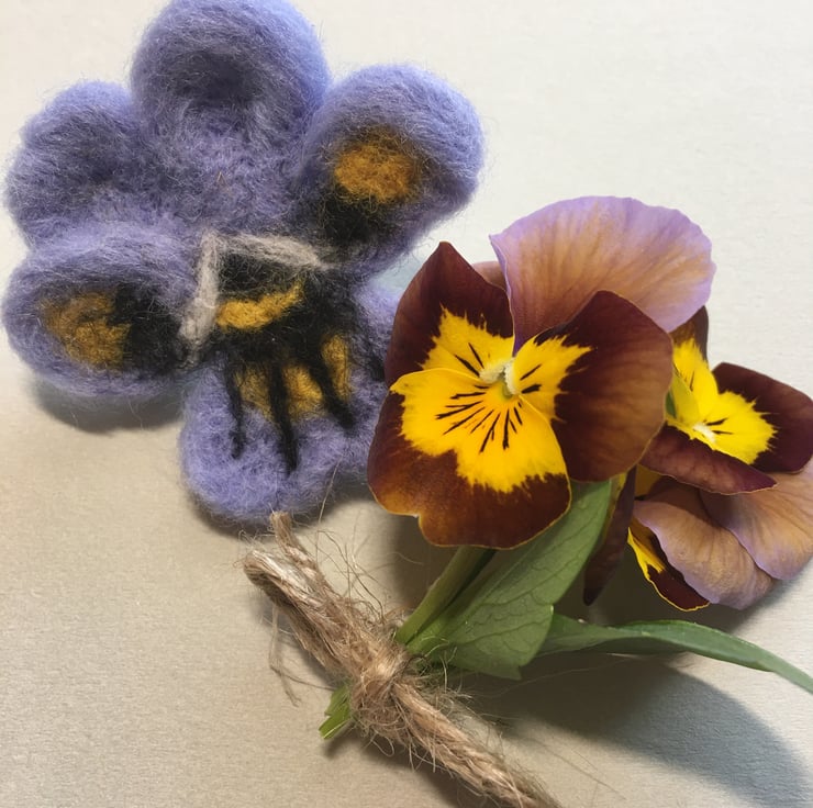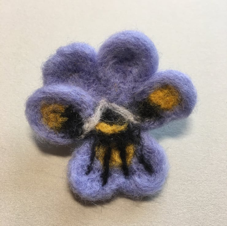 This needle felted pansy brooch has lilac petals with deep yellow black and a touch of white in its characteristic markings.