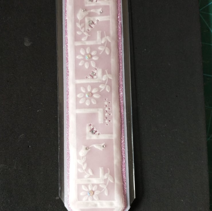 A completely handmade and uniquely designed bookmark. Consisting of parchment which has been cut, pierced and embossed. Finished off with rhinestones. Mounted onto pink glitter then grey flecked card.