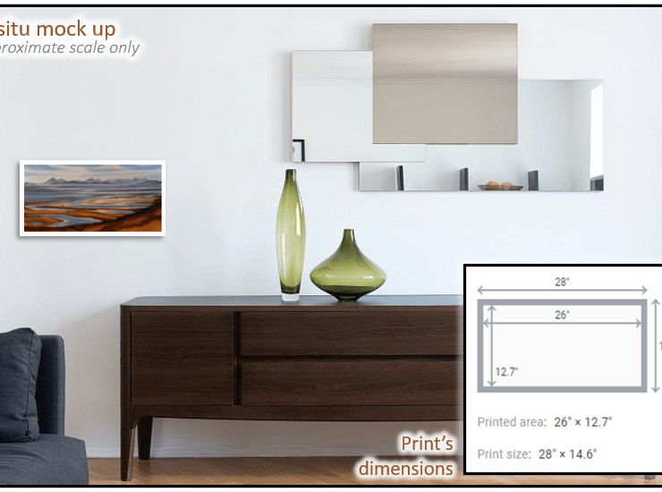 This particular print is 26" x 12.7" with an additional 1” white border on all sides, making the whole piece 28" x 14.7" in size. The print’s resolution will be 201 DPI.
