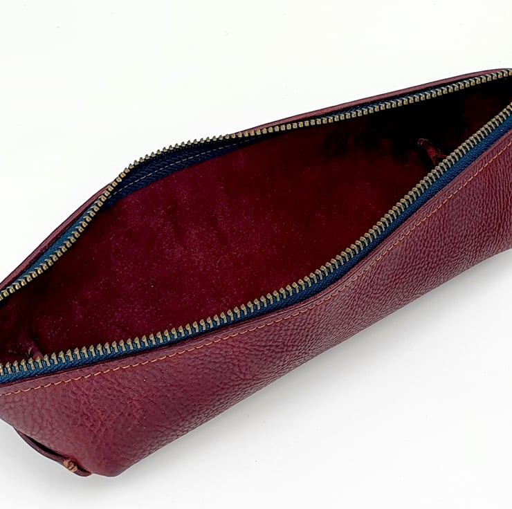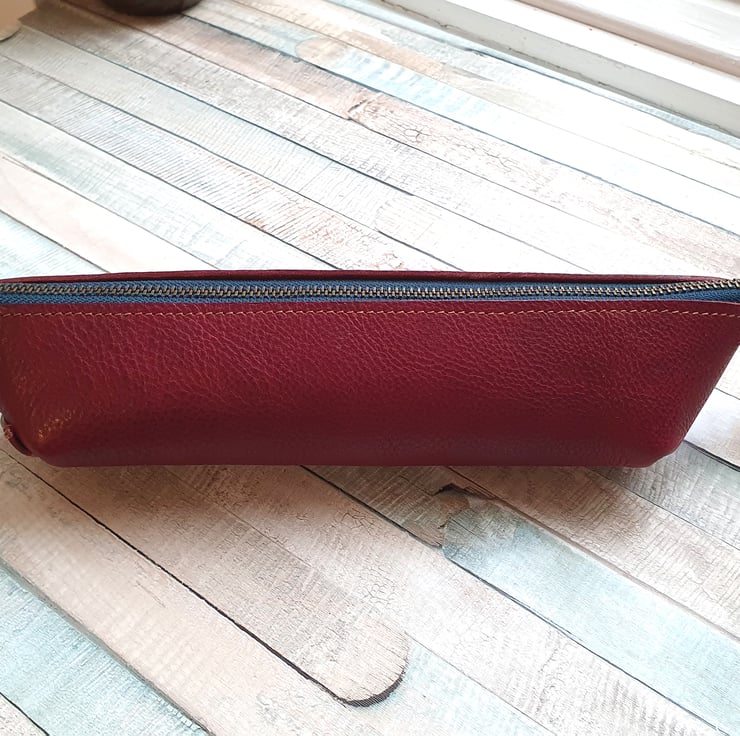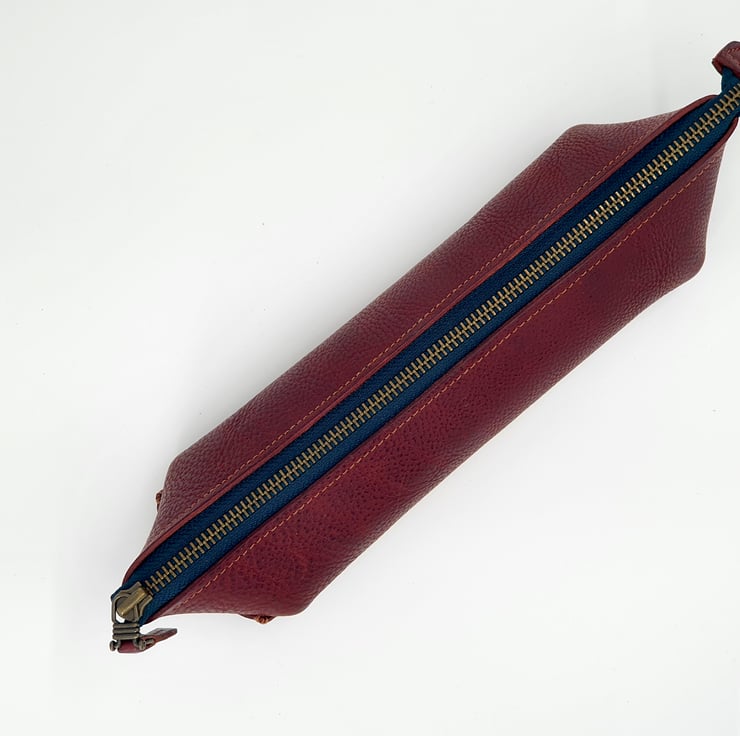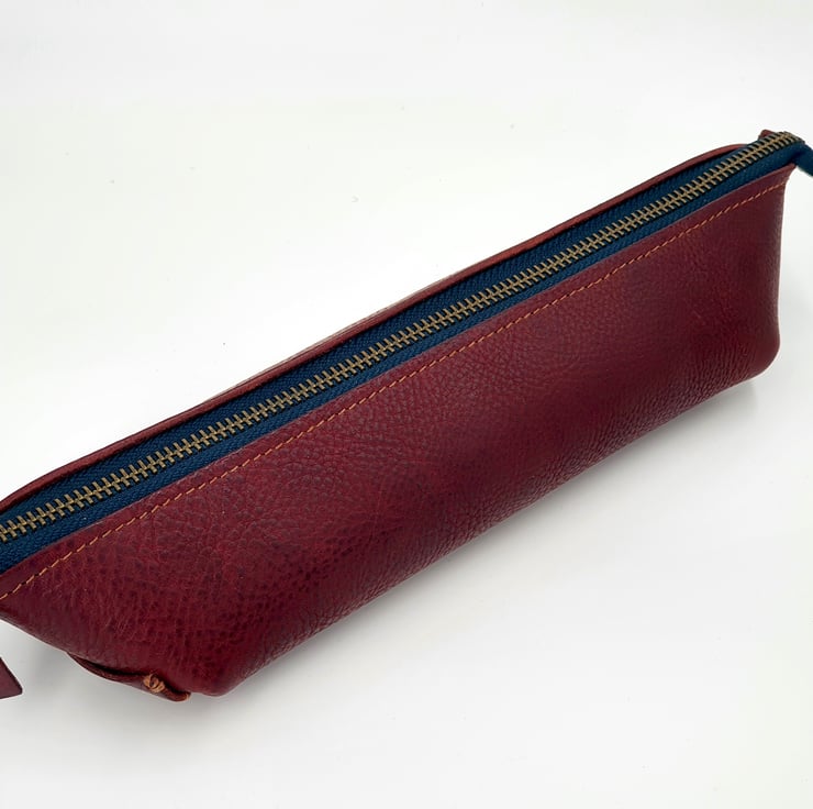 Beautiful rich, deep red veg- tanned leather pencil case, with a contrasting dark blue zip tape.