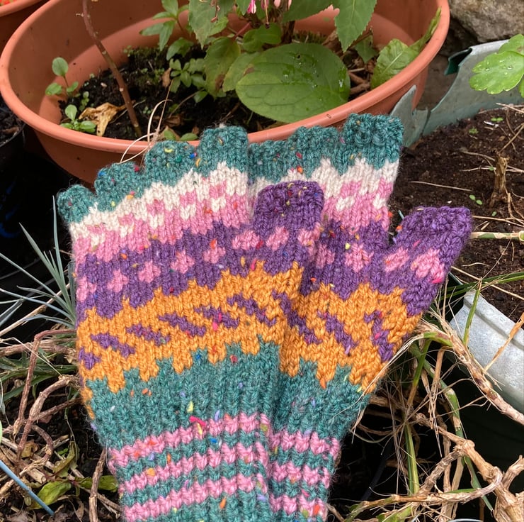 These colourful warm gloves are hand knitted using a 70% Acrylic and 30% Wool yarn, which has little flecks of colour spun into it which give a Tweed effect to it. They are an adult unisex size measuring 21.5 cm from the top of the gloves to the bottom and are 12 cm wide across the palm area at the base of the thumb. Like most knitted garments there is some stretch in these gloves. They should be hand washed in a cool wash.
