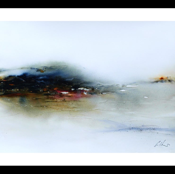 Working from my home studio on the beautiful Isle of Mull off the west coast of Scotland, my paintings are inspired by the wonderful Seascapes, Landscapes and Wildlife that surround me. This particular painting is an abstract Landscape work, distant mountains, an uncertain crossing.