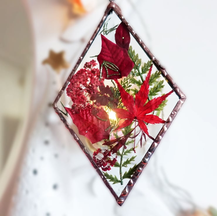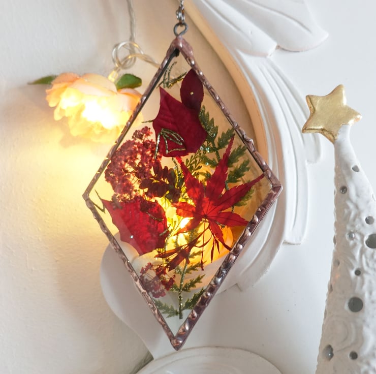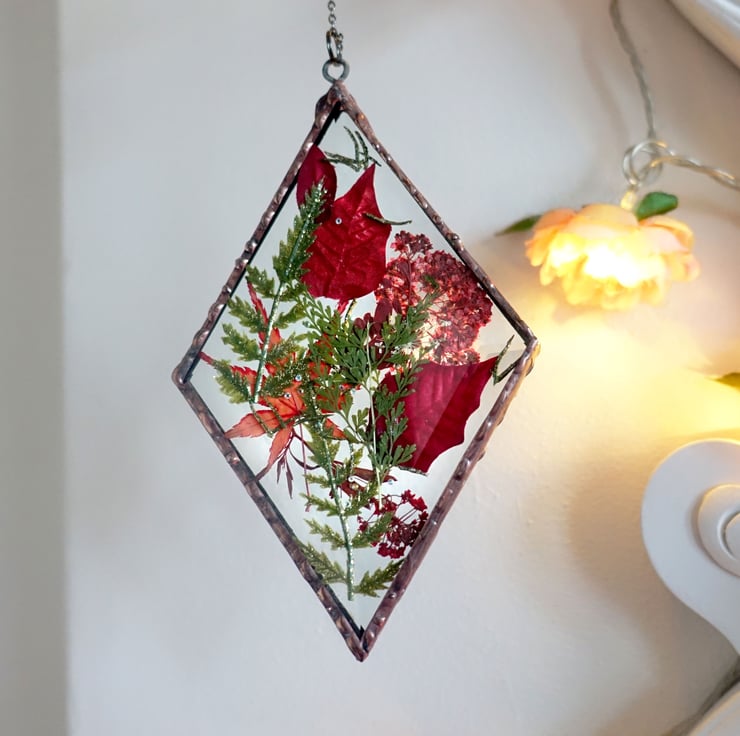 Reduced from £35. This diamond shaped bevelled glass suncatcher has a mix of wild meadow and hedgerow flowers in autumnal shades sprinkled with gold detail and tiny diamante jewels for added sparkle.